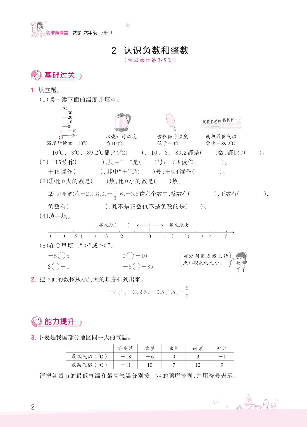 2022下册六年级数学冀教版 一 生活中的负数——2 认识负数和整数