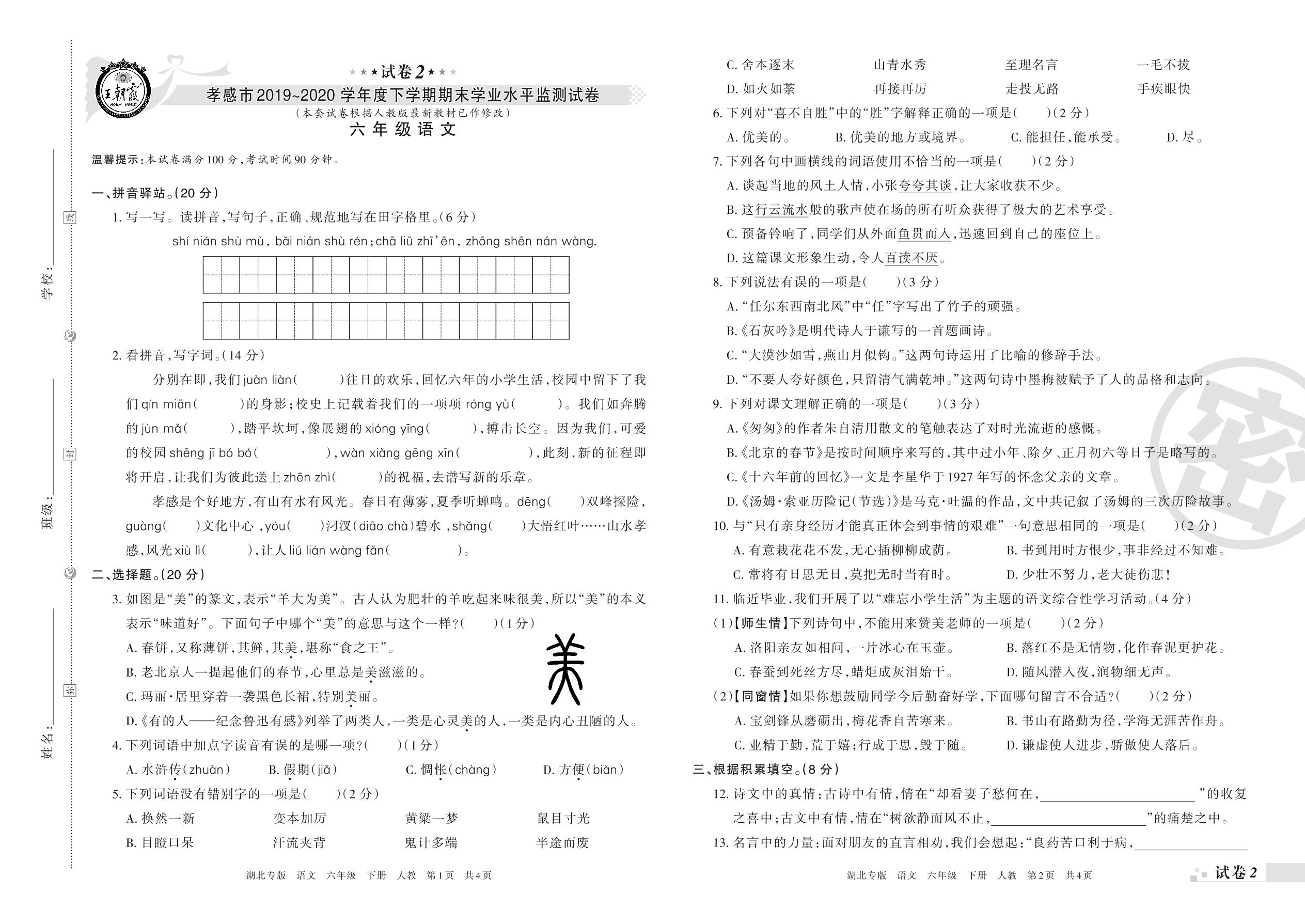 2019-2020学年第二学期孝感市六年级语文试卷(人教版)【2】