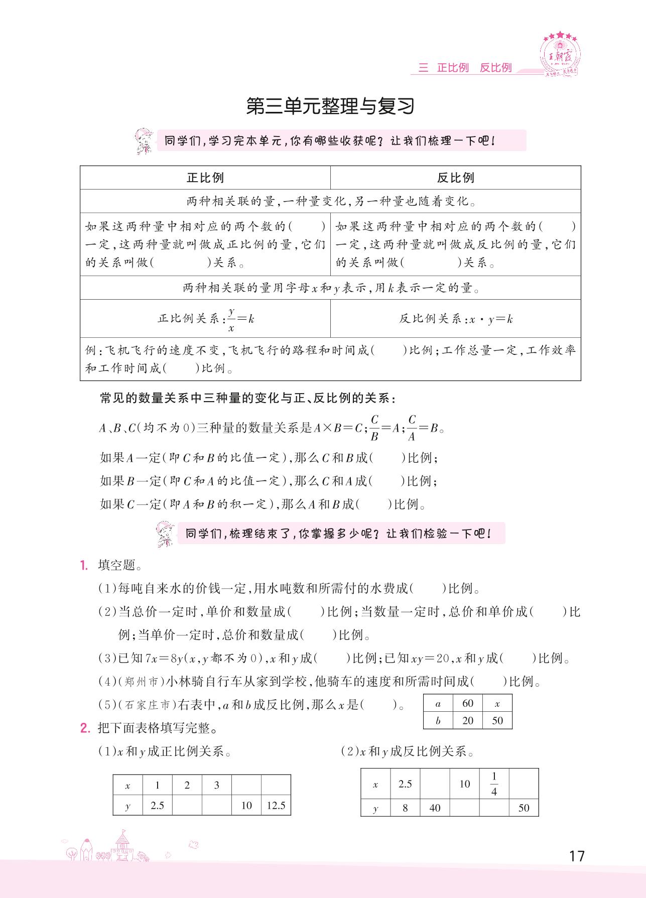 2022下册六年级数学冀教版 三 正比例 反比例——第三单元整理与复习
