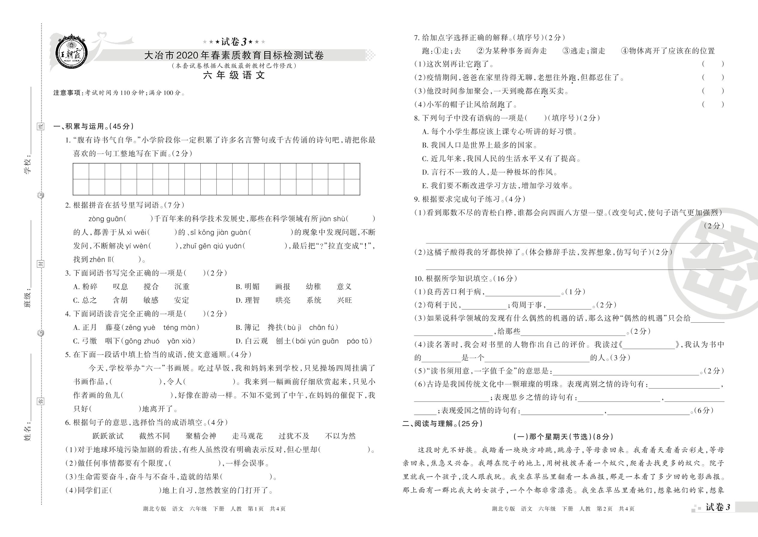 2019-2020学年第二学期大冶市六年级语文试卷(人教版)【3】