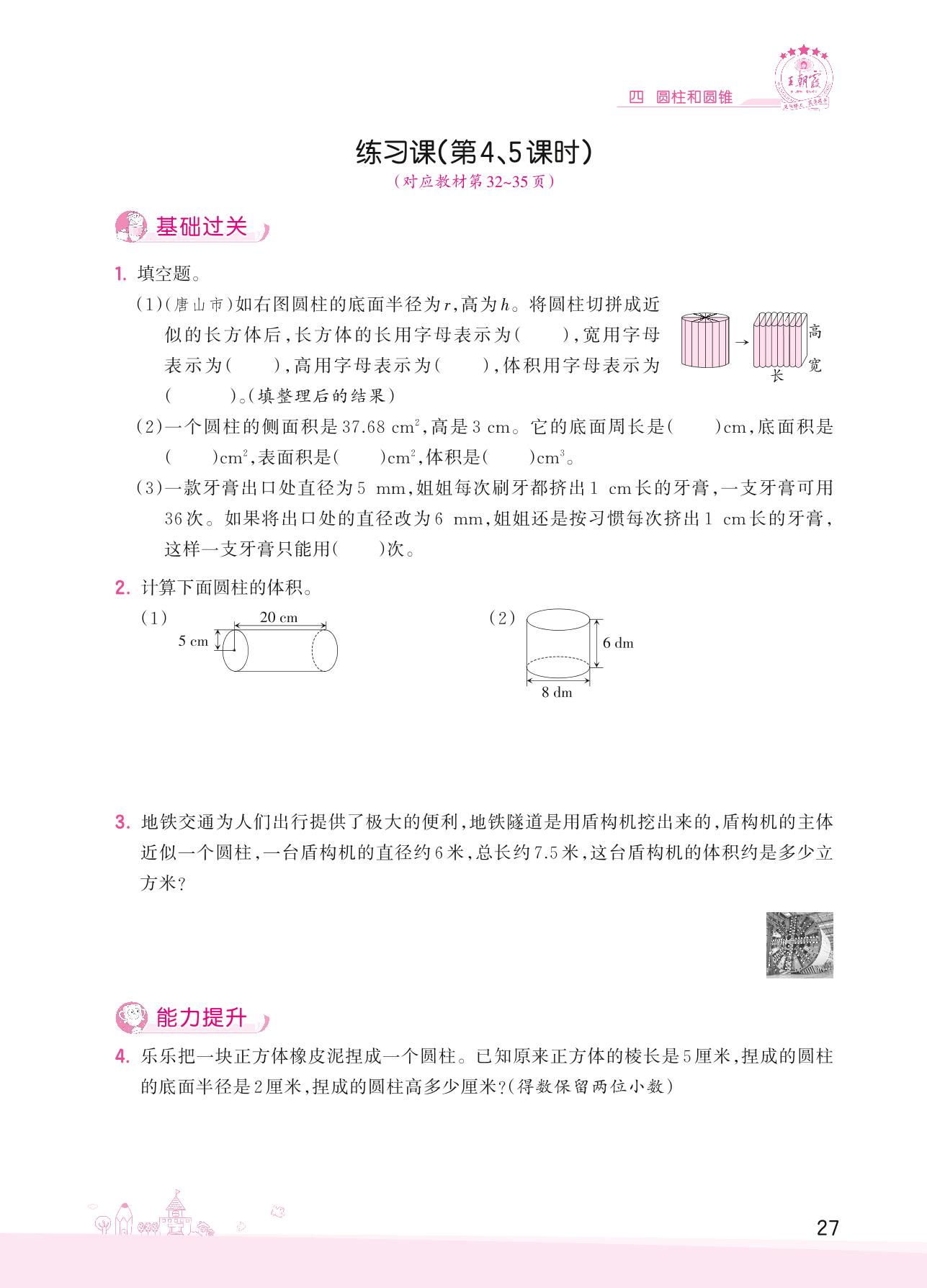 2022下册六年级数学冀教版 四 圆柱和圆锥——练习课(第4、5课时)