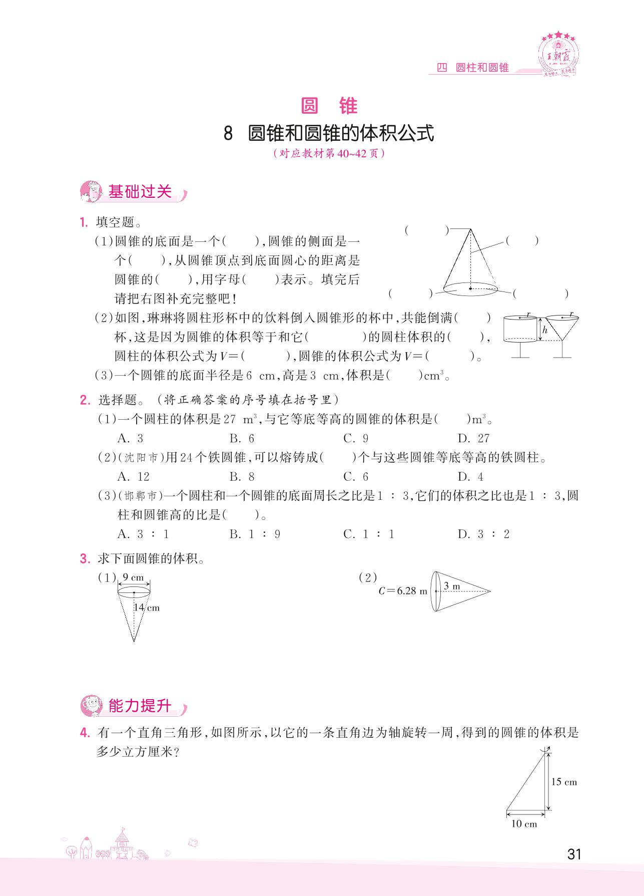 2022下册六年级数学冀教版 四 圆柱和圆锥——8 圆锥和圆锥的体积公式