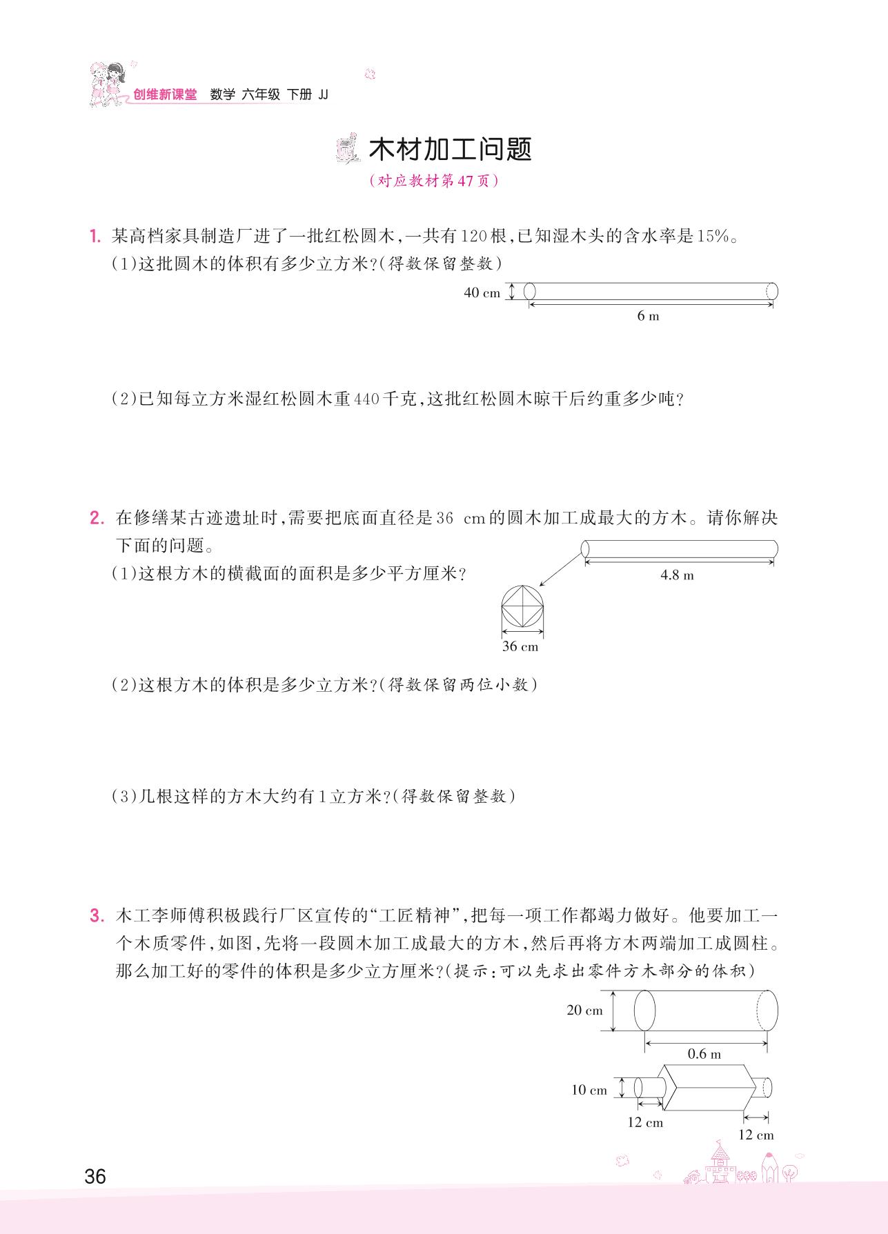 2022下册六年级数学冀教版 四 圆柱和圆锥——木材加工问题