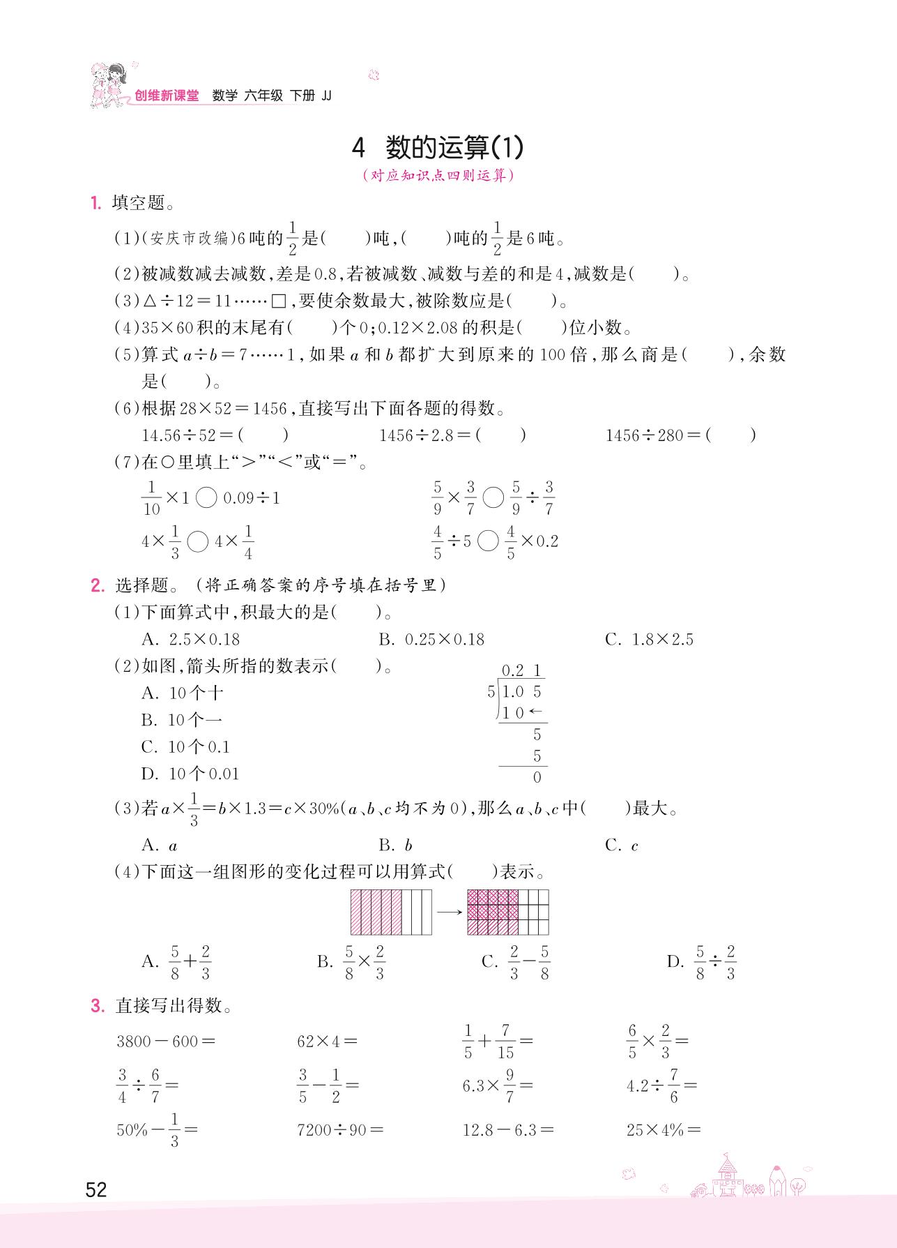 2022下册六年级数学冀教版 六 回顾与整理——4 数的运算(1)
