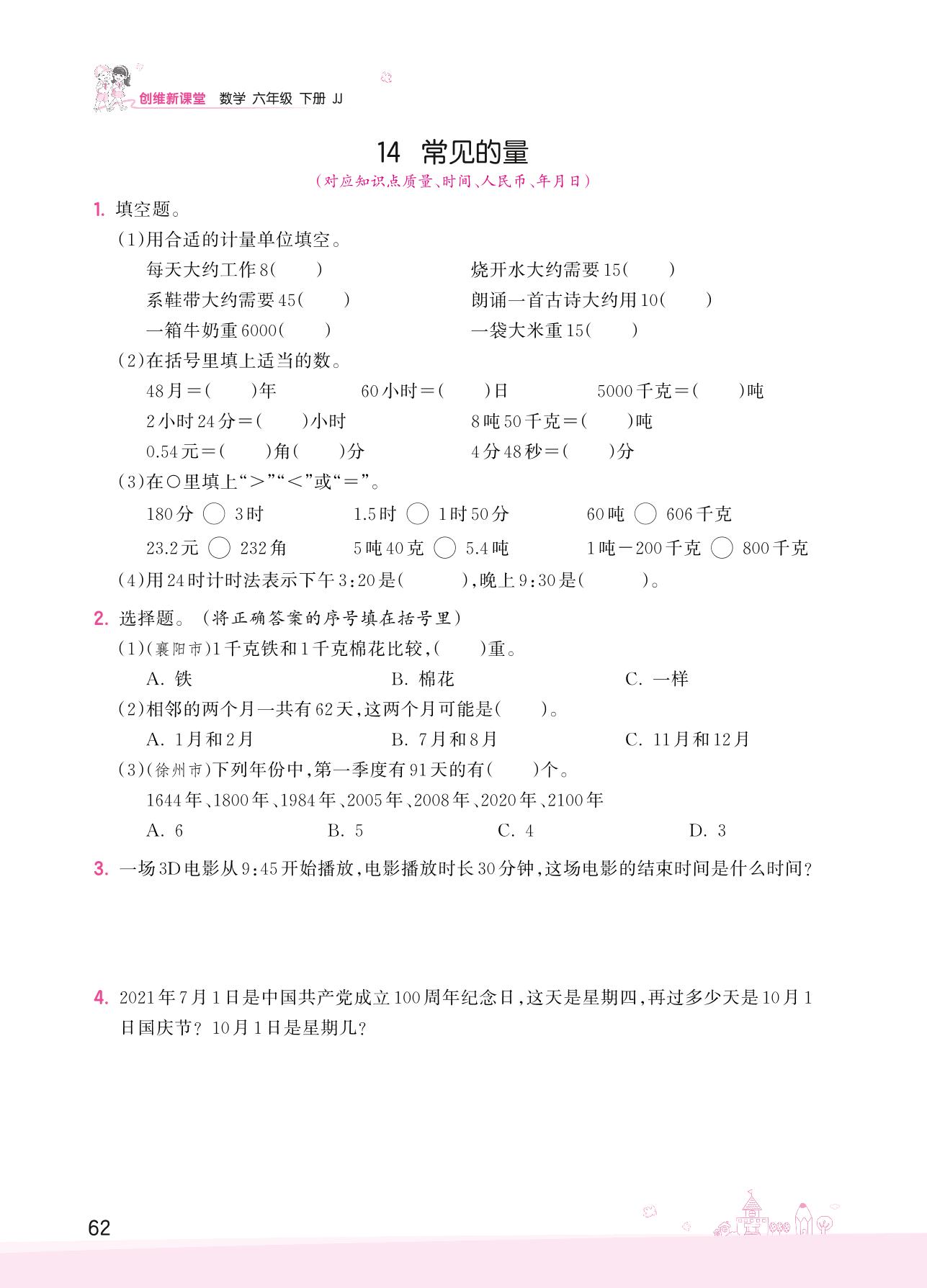 2022下册六年级数学冀教版 六 回顾与整理——14 常见的量