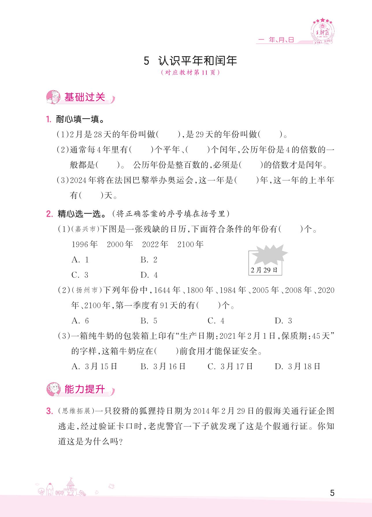 2022下册三年级数学冀教版 一 年、月、日——5 认识平年和闰年