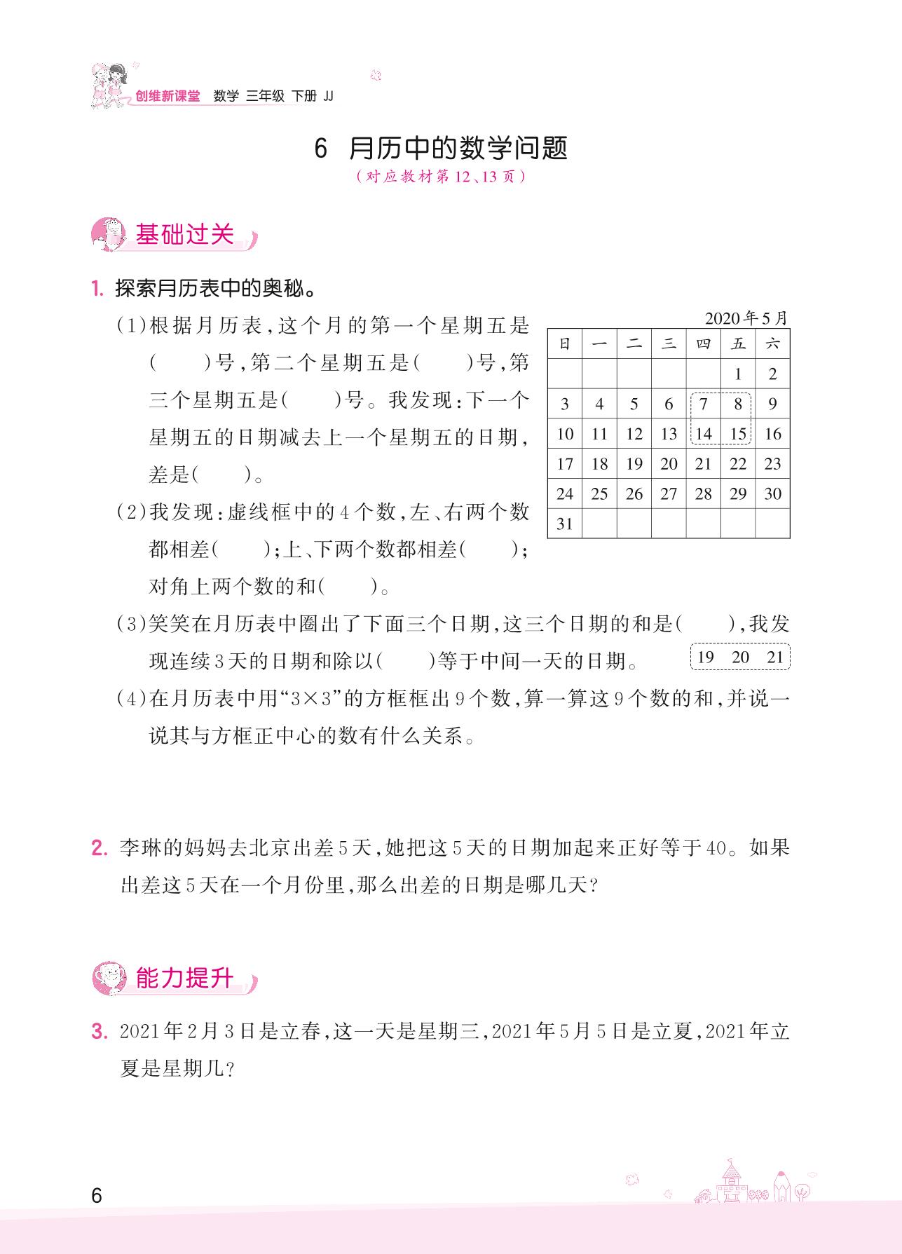 2022下册三年级数学冀教版 一 年、月、日——6 月历中的数学问题