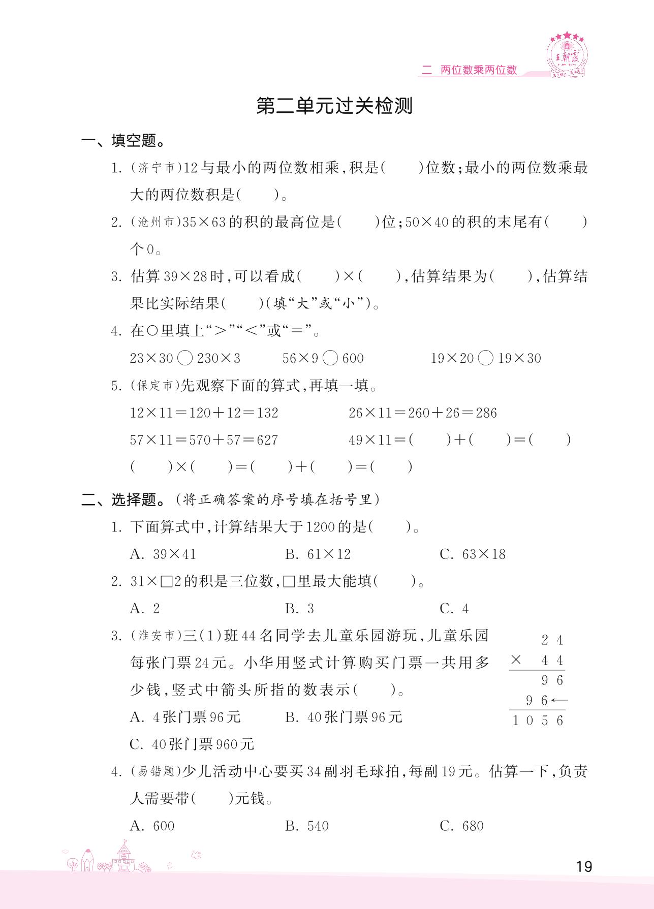 2022下册三年级数学冀教版 二 两位数乘两位数——第二单元过关检测