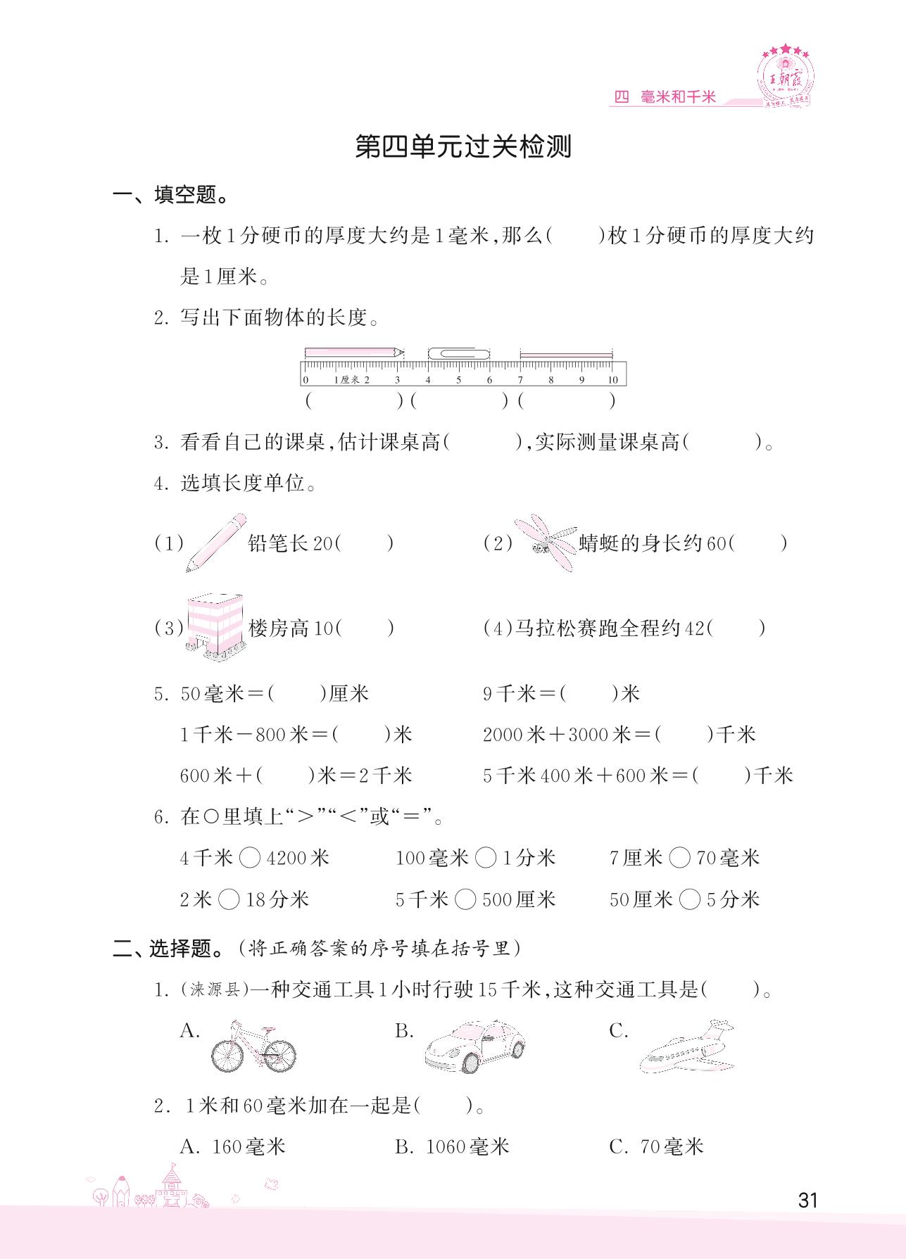 2022下册三年级数学冀教版 四 毫米和千米——第四单元过关检测