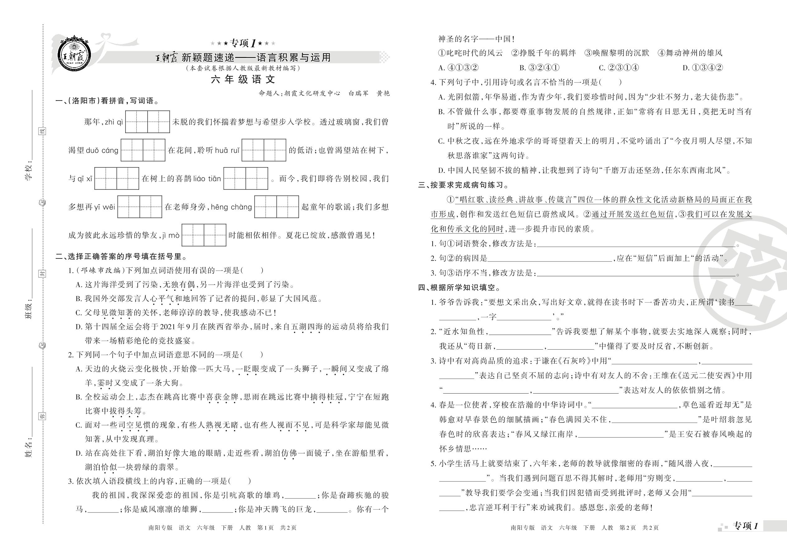 王朝霞期末专项卷——语言积累与运用、口语交际与综合性学习六年级下册语文(人教版)【0】