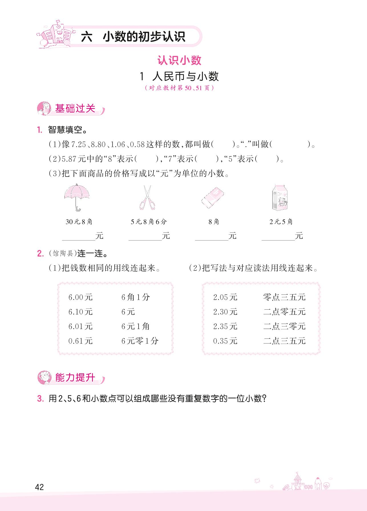 2022下册三年级数学冀教版 六 小数的初步认识——1 人民币与小数