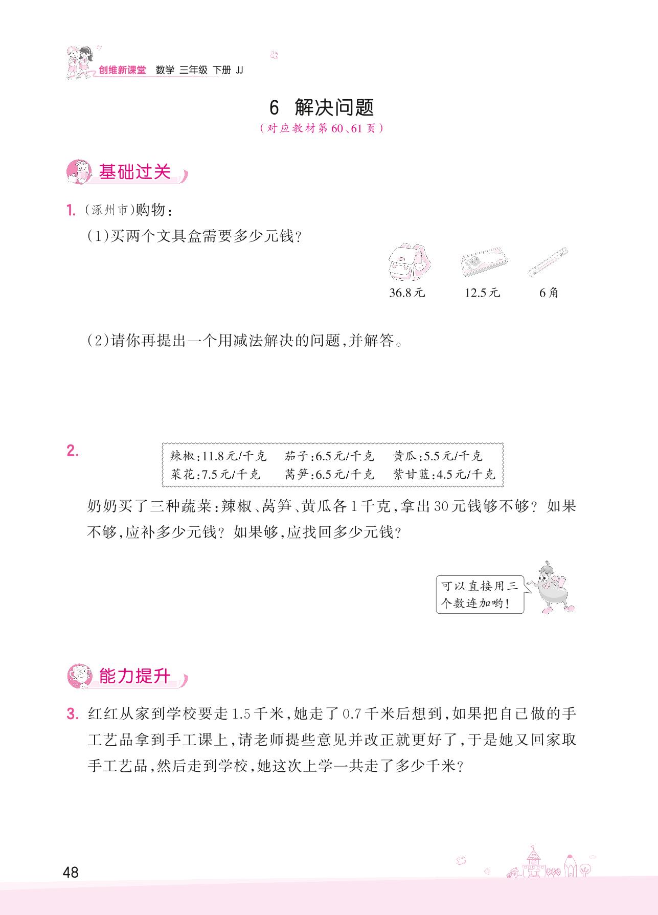 2022下册三年级数学冀教版 六 小数的初步认识——6 解决问题
