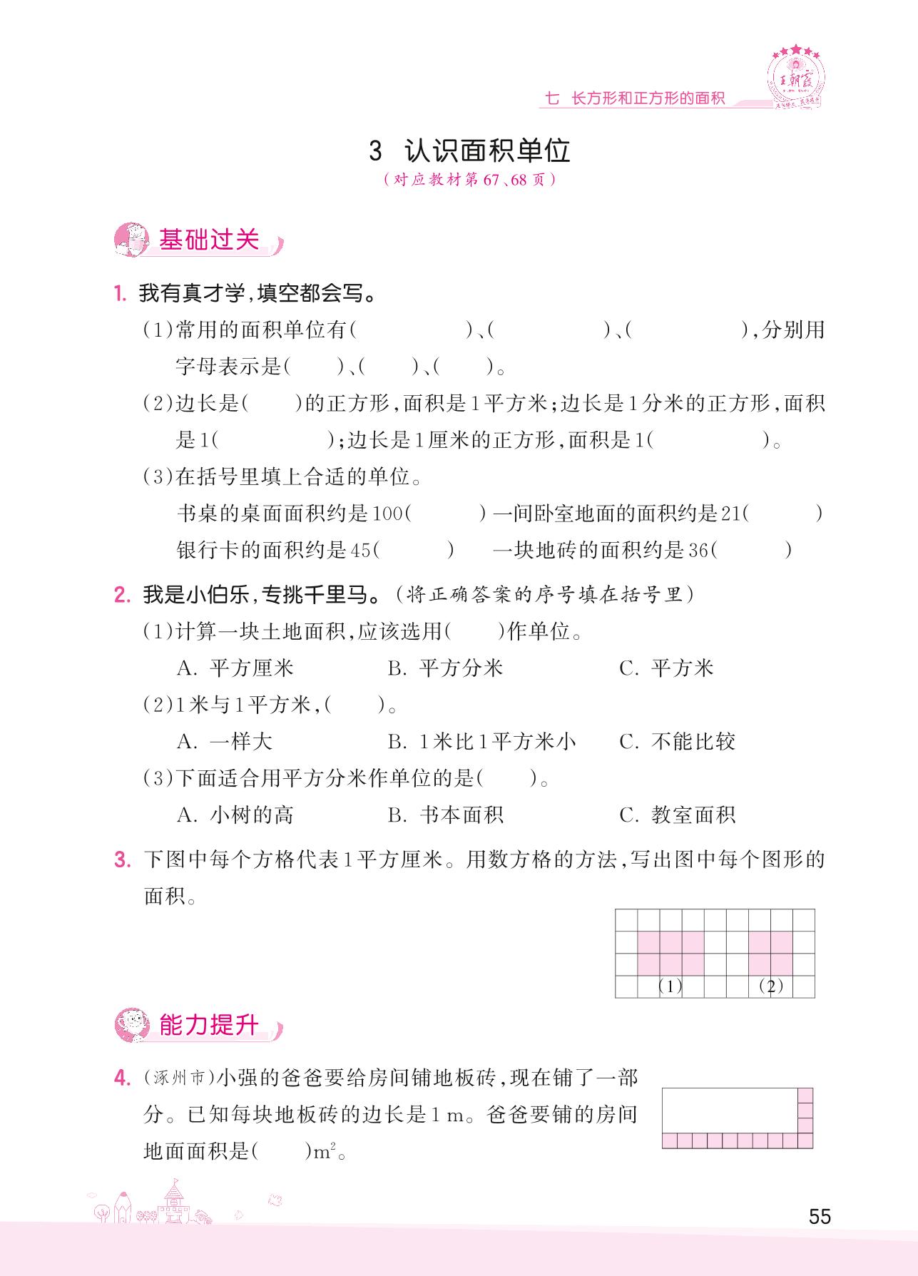 2022下册三年级数学冀教版 七 长方形和正方形的面积——3 认识面积单位