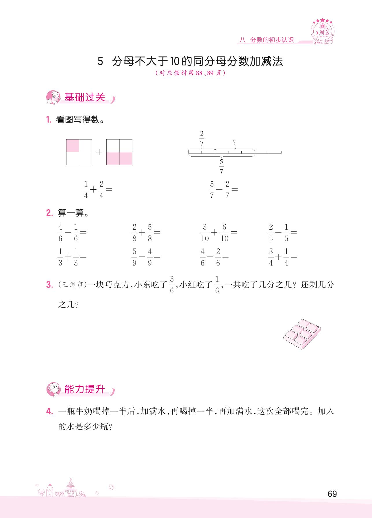 2022下册三年级数学冀教版 八 分数的初步认识——5 分母不大于10的同分母分数加减法