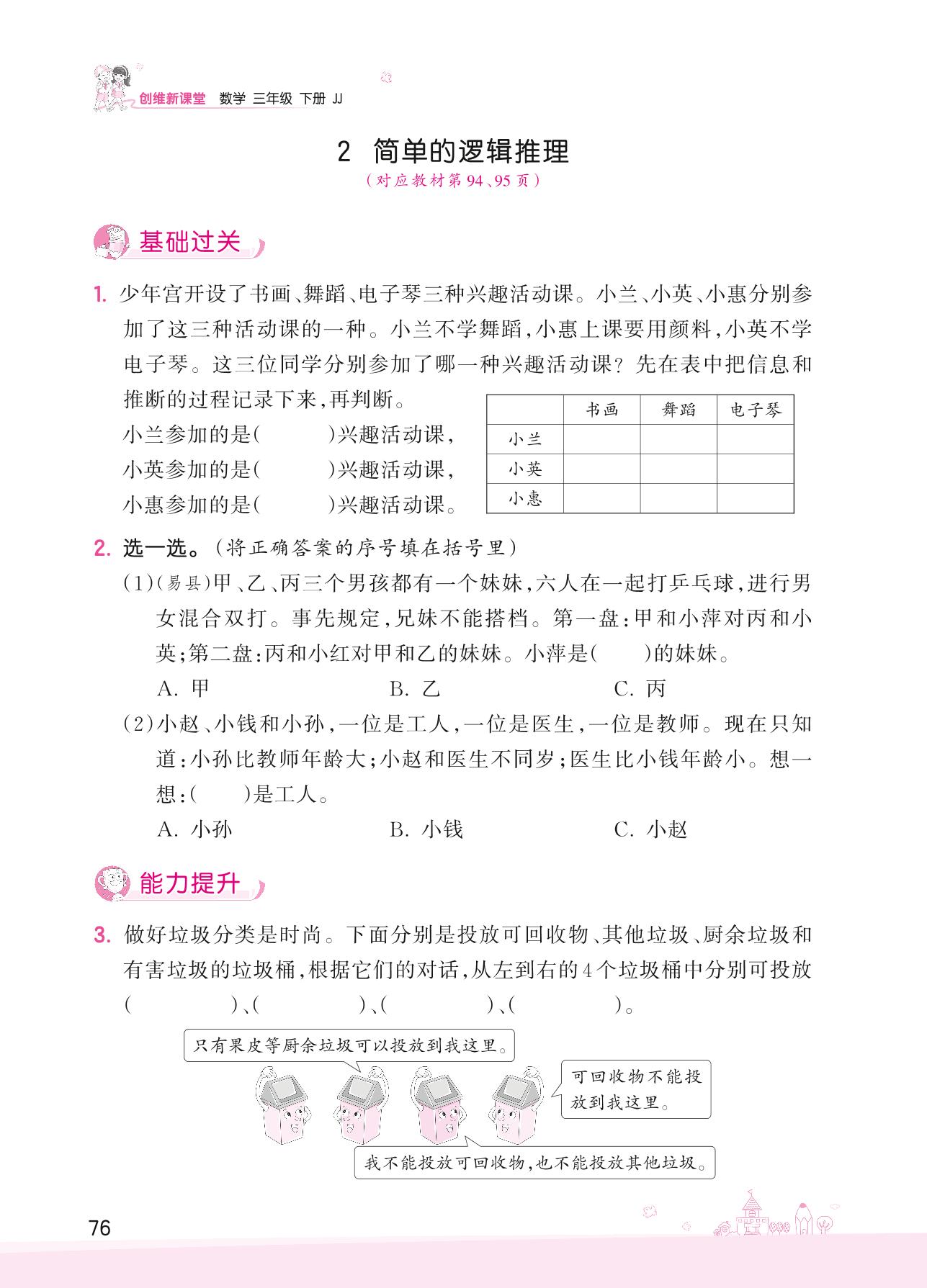2022下册三年级数学冀教版 九 探索乐园——2 简单的逻辑推理