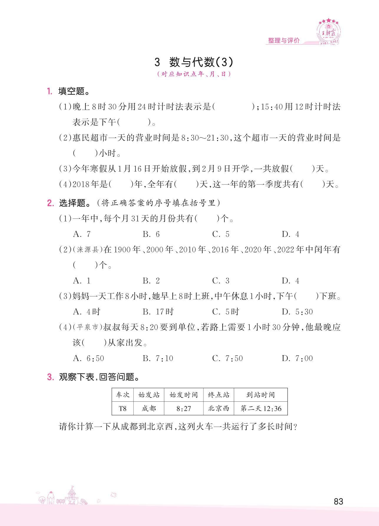 2022下册三年级数学冀教版 整理与评价——3 数与代数(3)