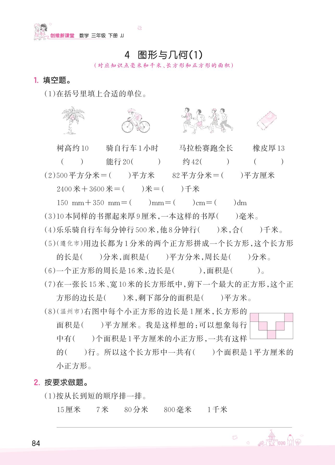 2022下册三年级数学冀教版 整理与评价——4 图形与几何(1)