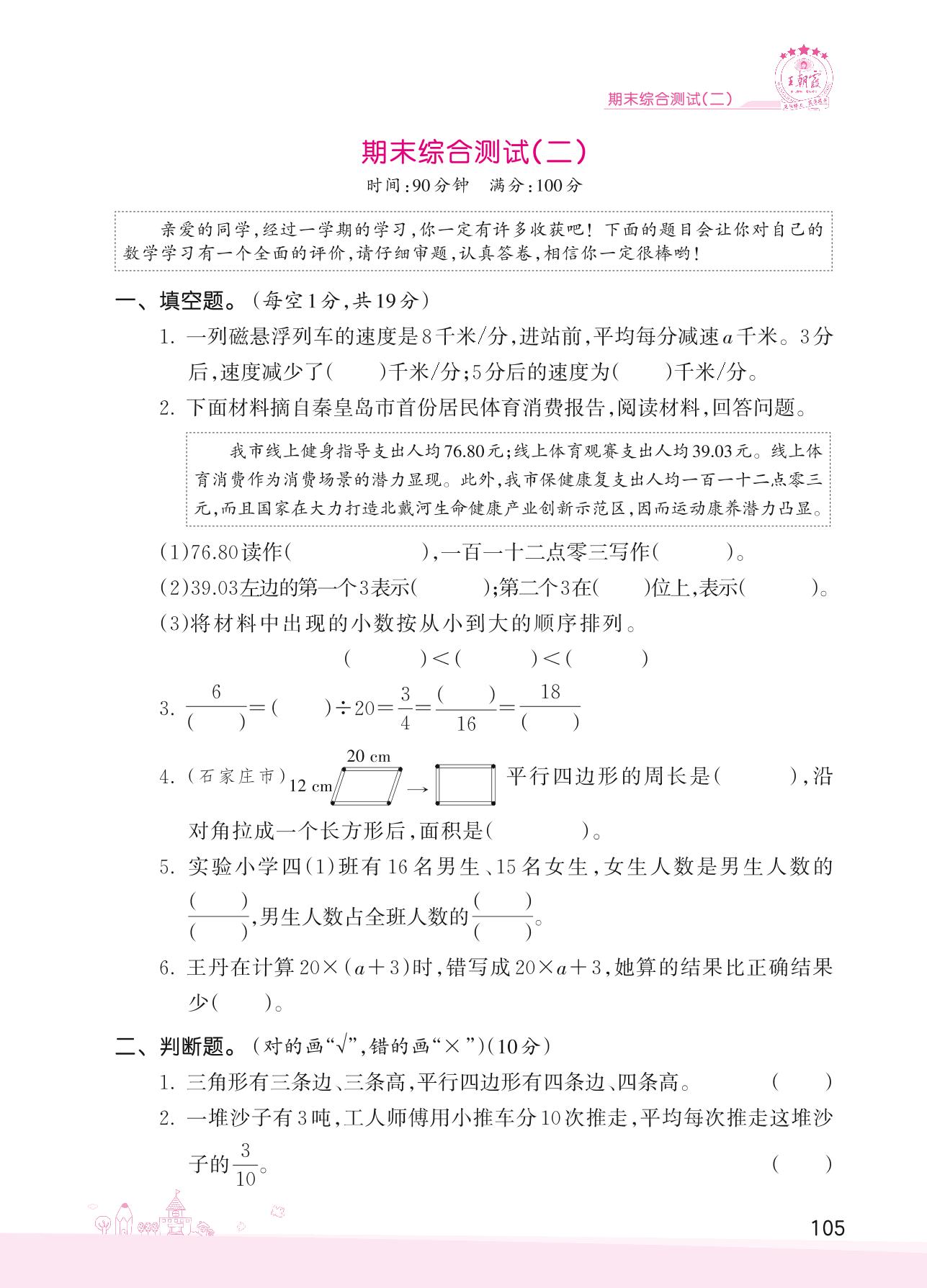 2022下册四年级数学冀教版 期末综合测试(二)