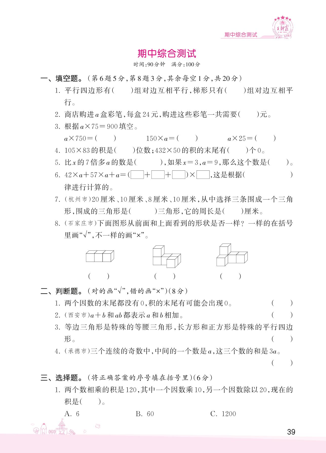 2022下册四年级数学冀教版 期中综合测试