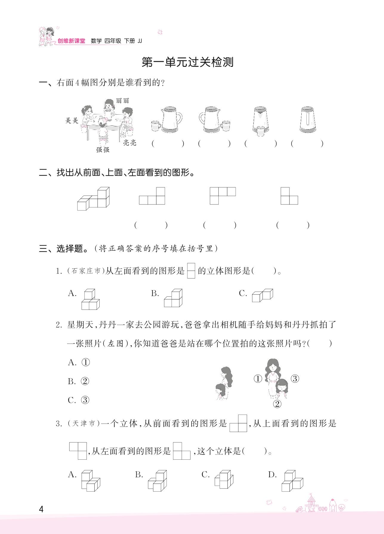2022下册四年级数学冀教版 一 观察物体(二)——第一单元过关检测