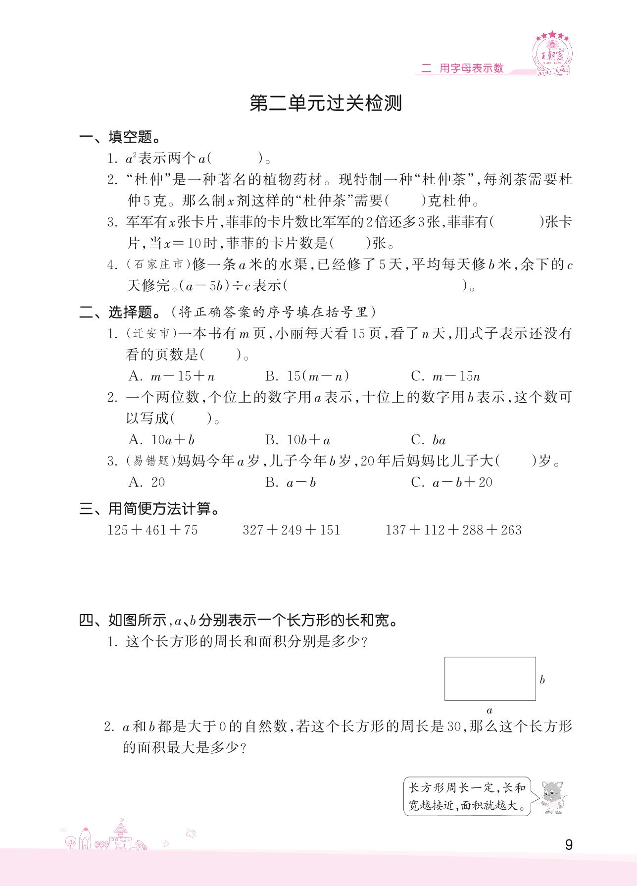 2022下册四年级数学冀教版 二 用字母表示数——第二单元过关检测