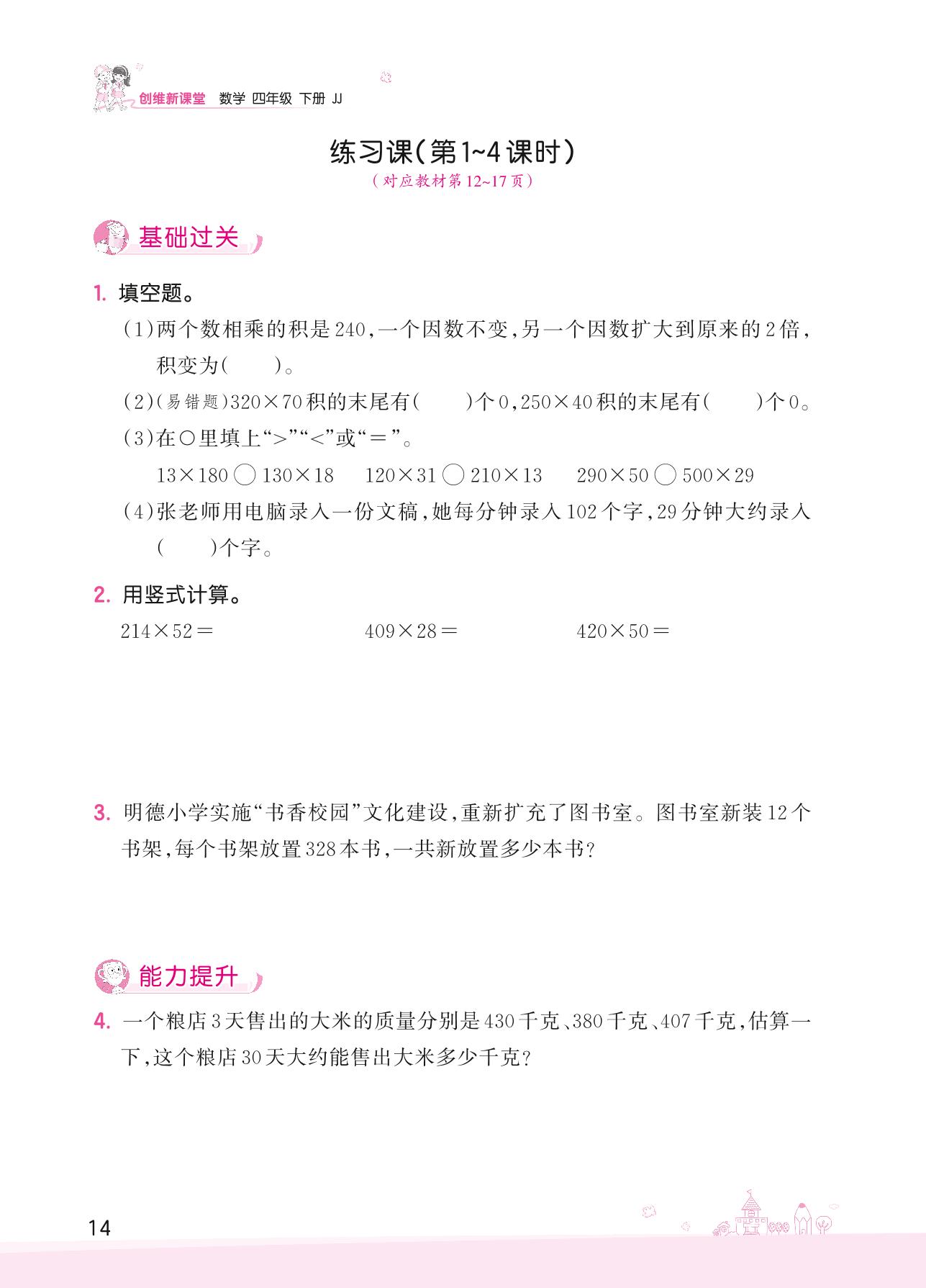 2022下册四年级数学冀教版 三 三位数乘两位数——练习课(第1~4课时)