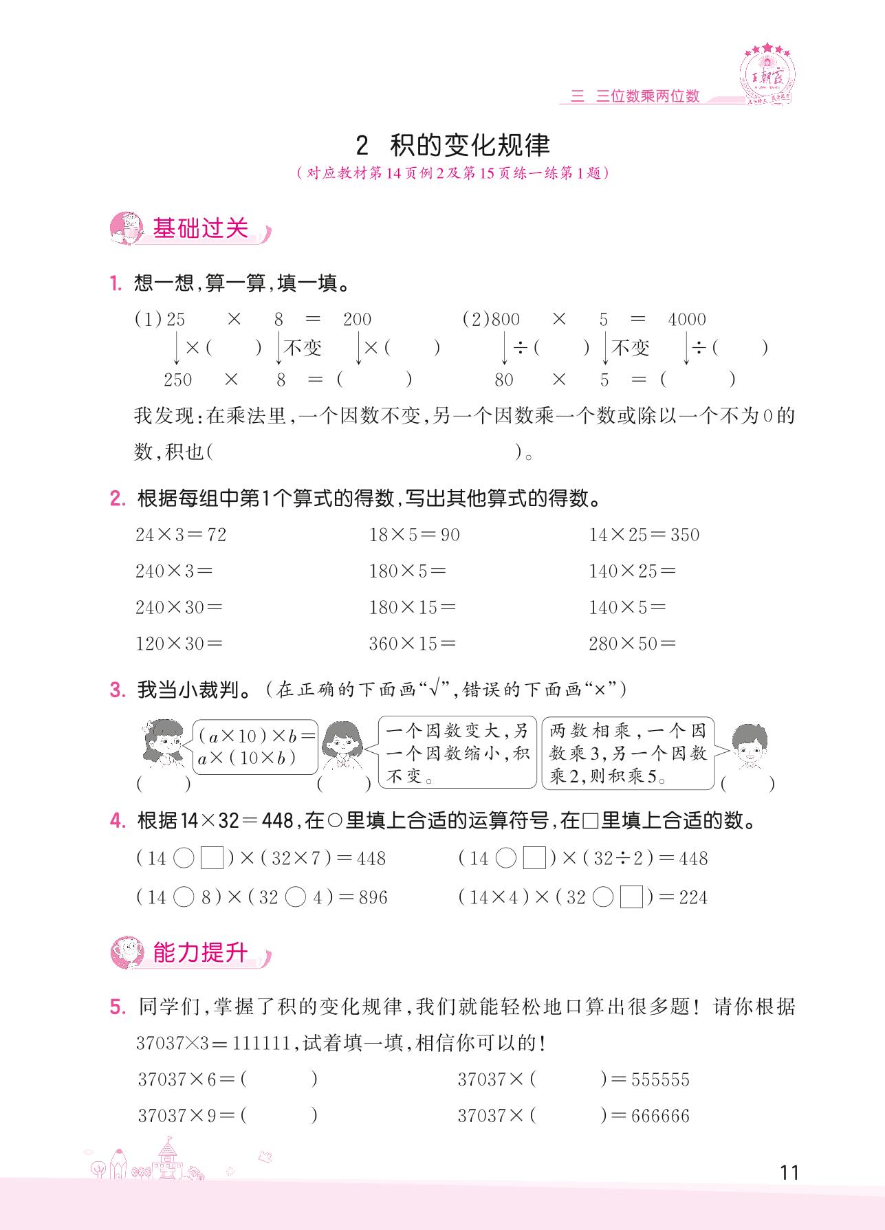 2022下册四年级数学冀教版 三 三位数乘两位数——2 积的变化规律