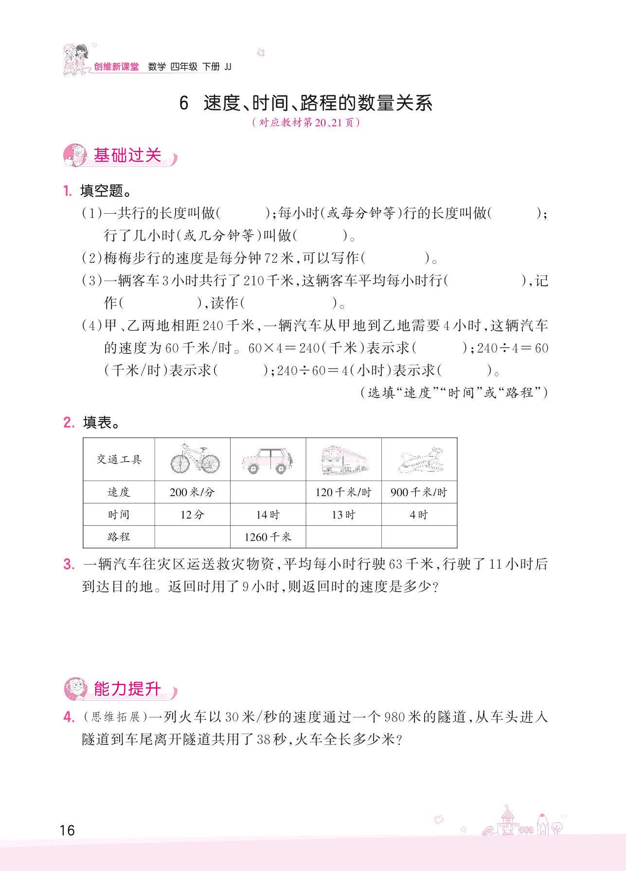 2022下册四年级数学冀教版 三 三位数乘两位数——6 速度、时间、路程的数量关系