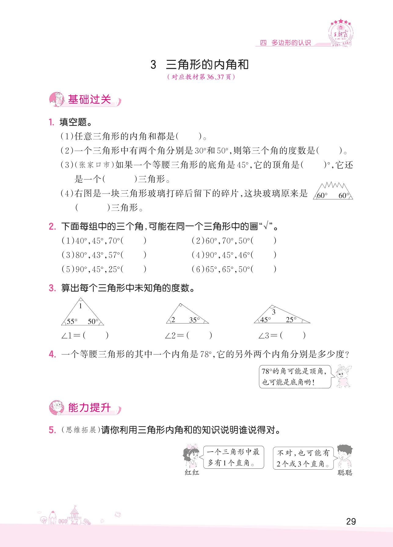 2022下册四年级数学冀教版 四 多边形的认识——3 三角形的内角和