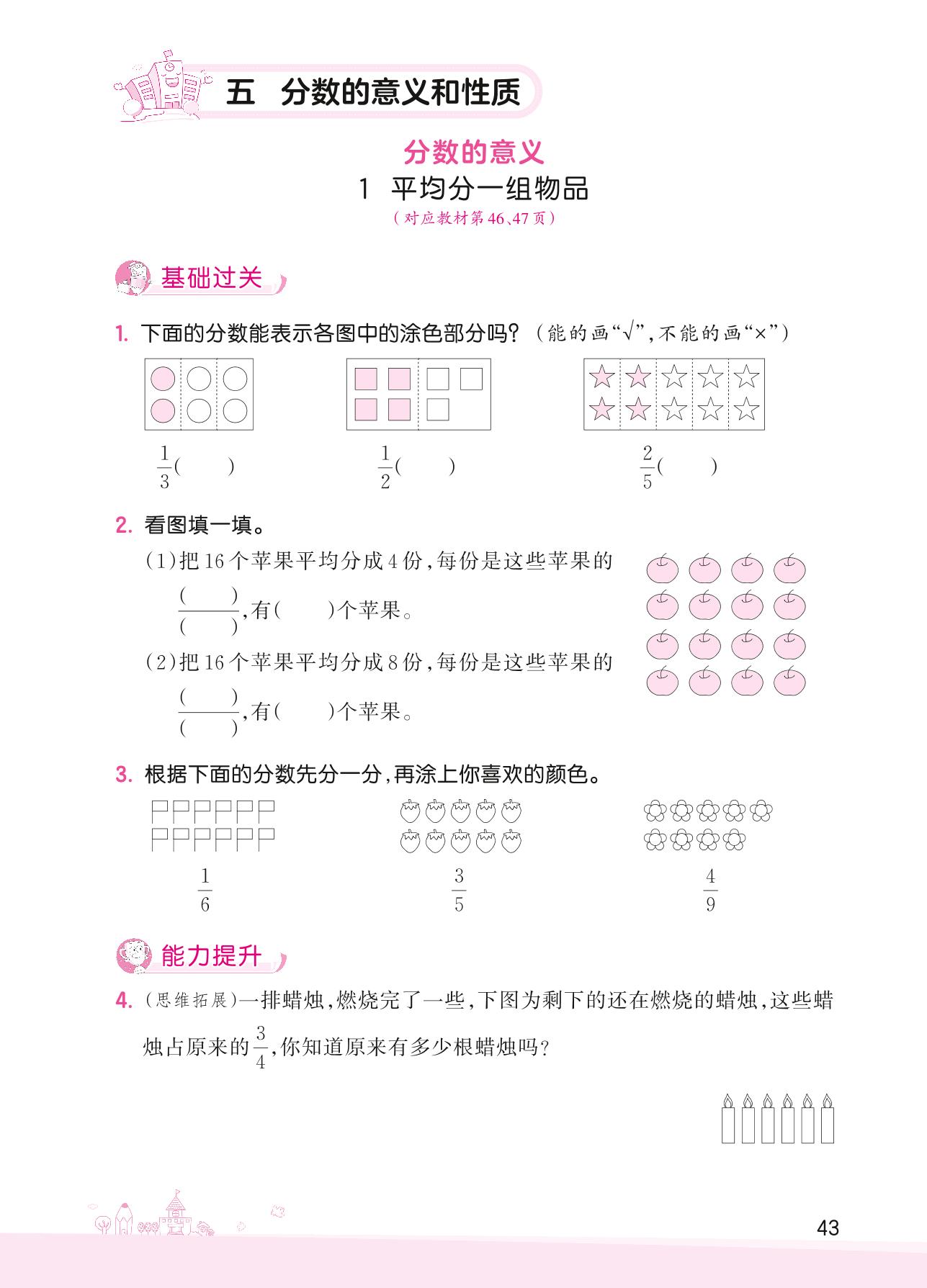 2022下册四年级数学冀教版 五 分数的意义和性质——1 平均分一组物品