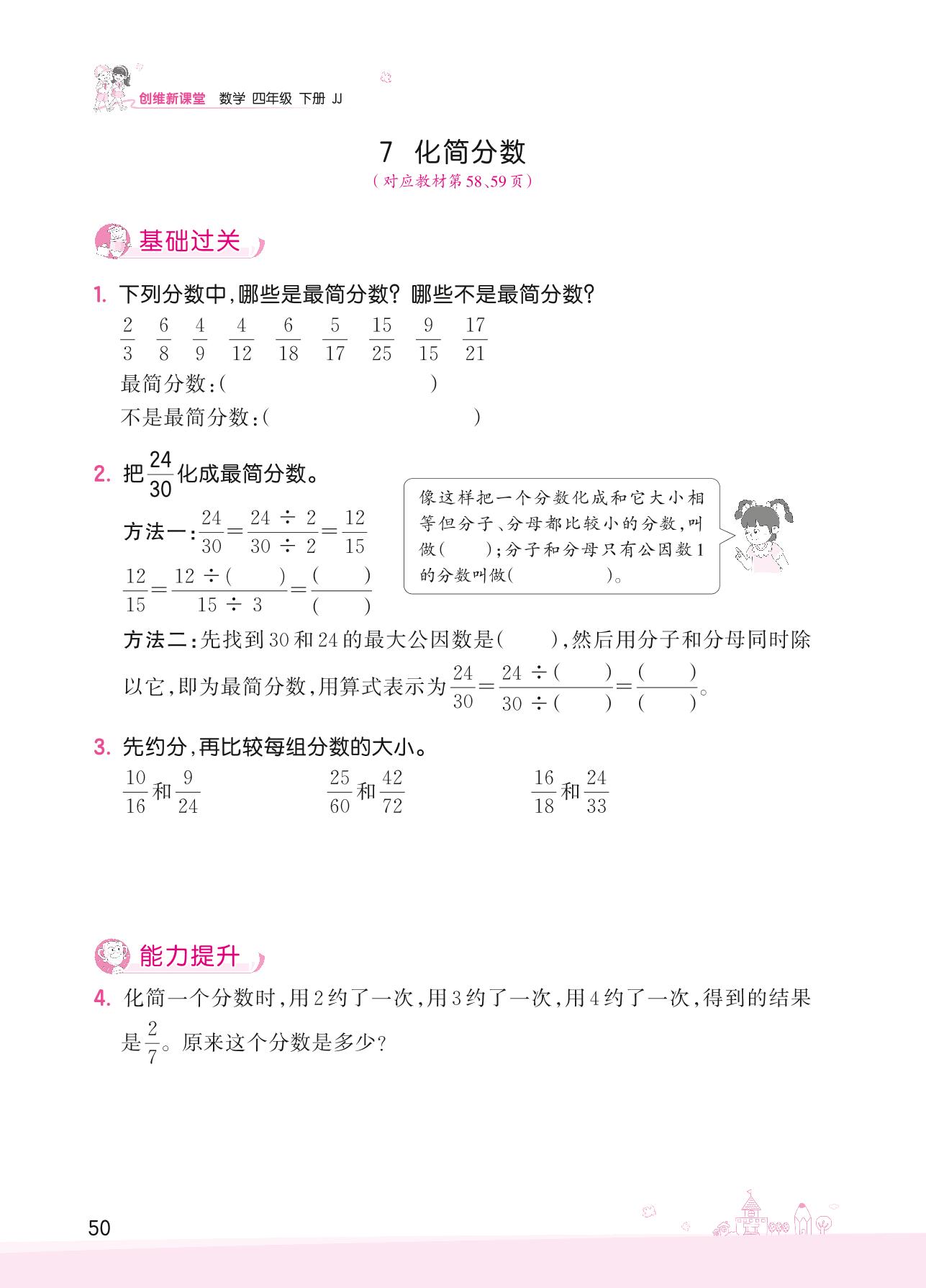 2022下册四年级数学冀教版 五 分数的意义和性质——7 化简分数