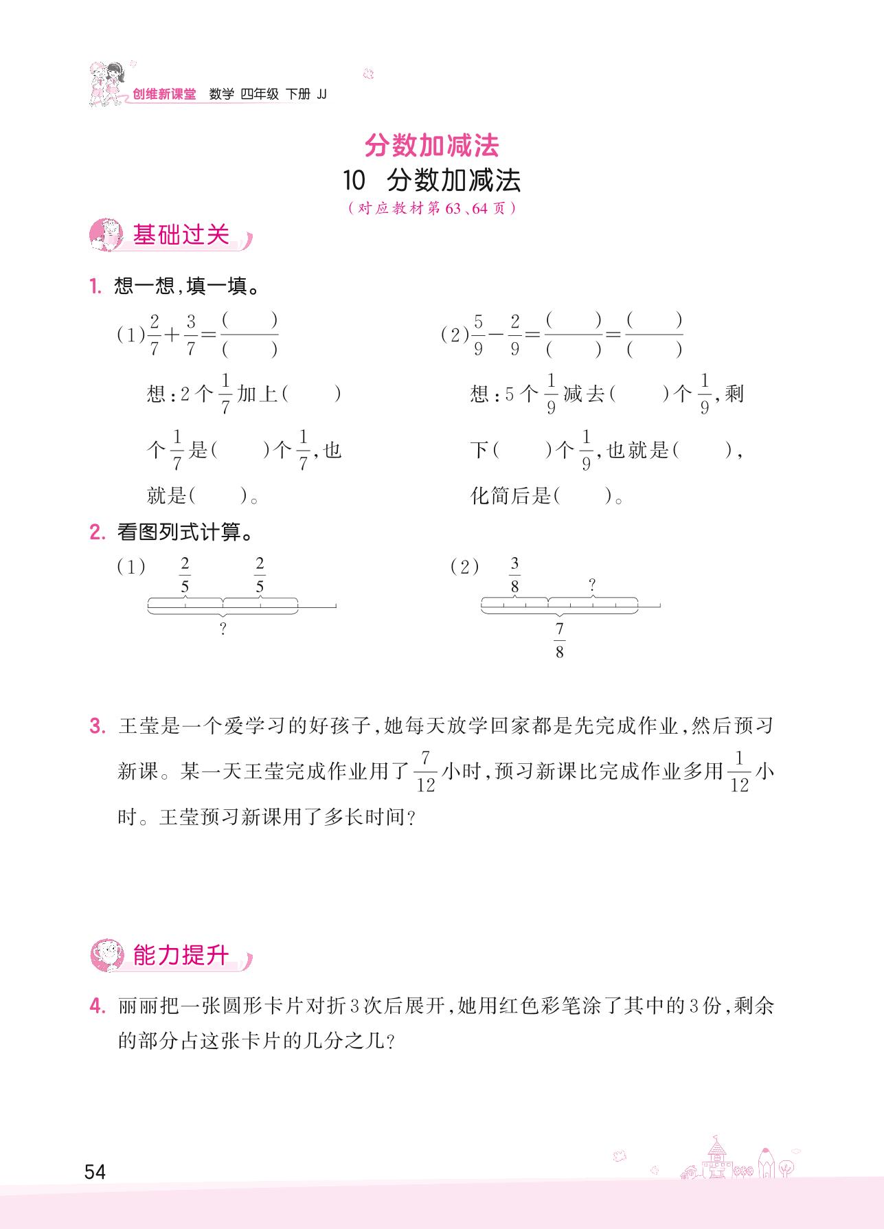 2022下册四年级数学冀教版 五 分数的意义和性质——10 分数加减法