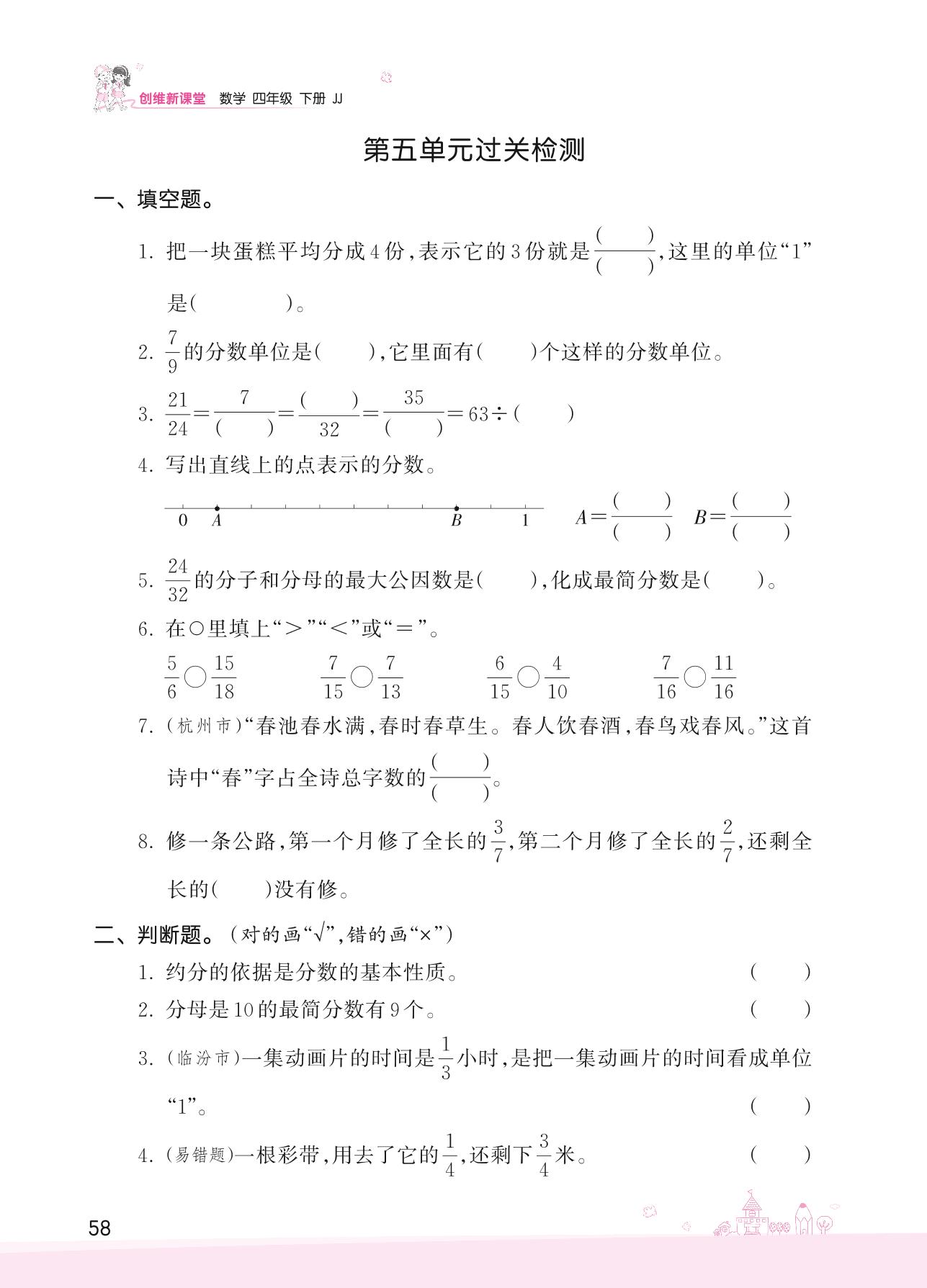 2022下册四年级数学冀教版 五 分数的意义和性质——第五单元过关检测