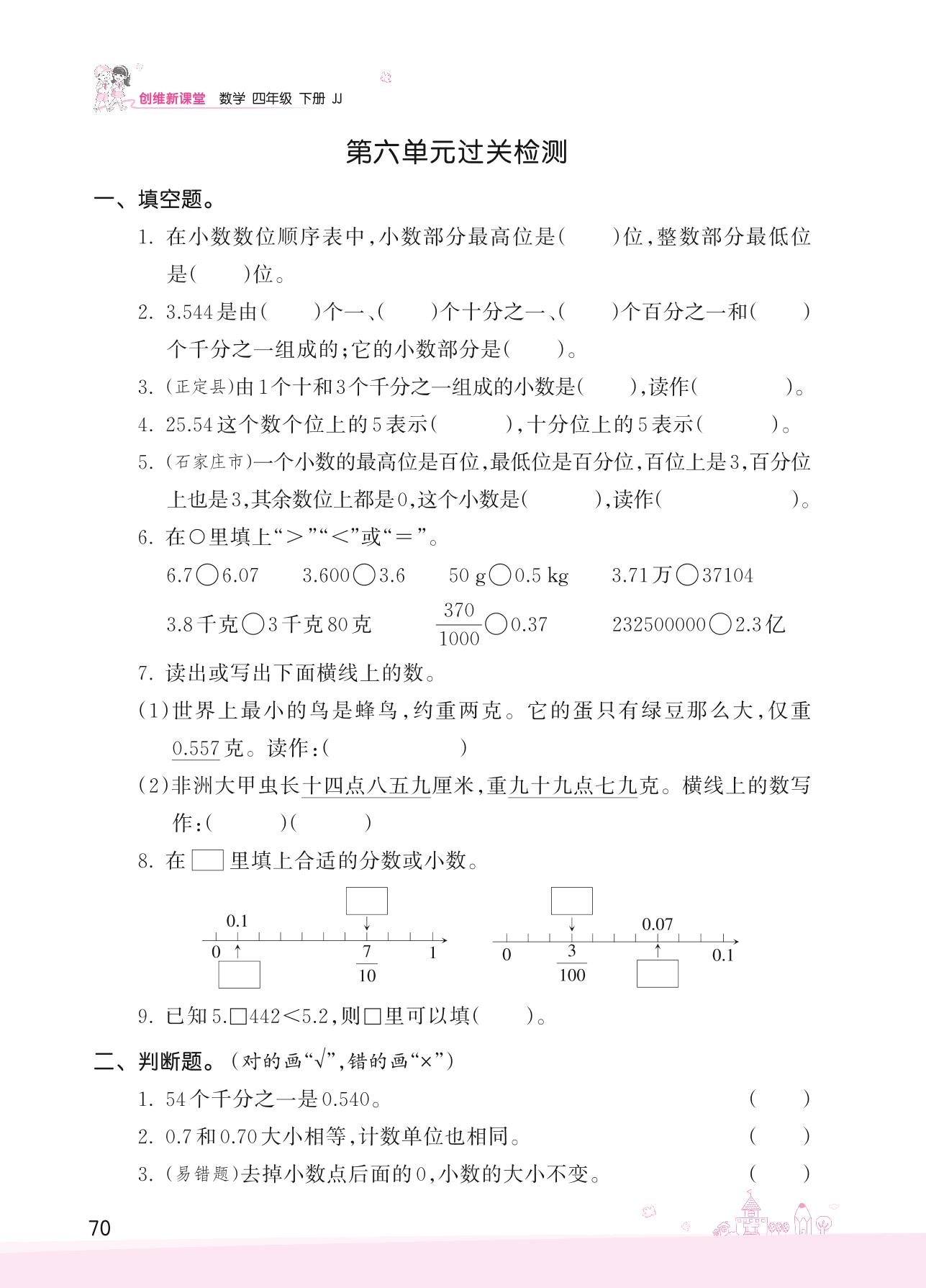 2022下册四年级数学冀教版 六 小数的认识——第六单元过关检测