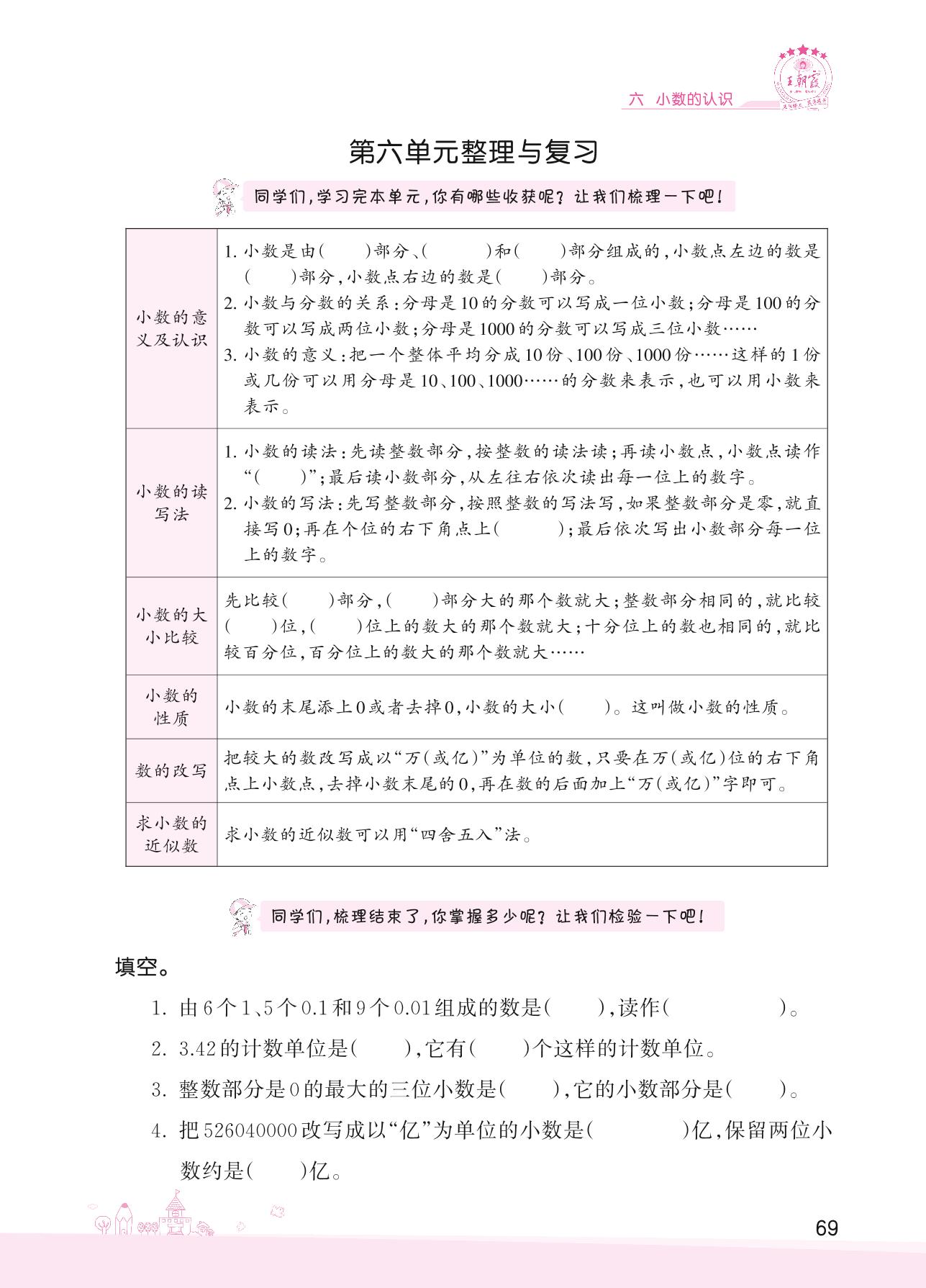 2022下册四年级数学冀教版 六 小数的认识——第六单元整理与复习