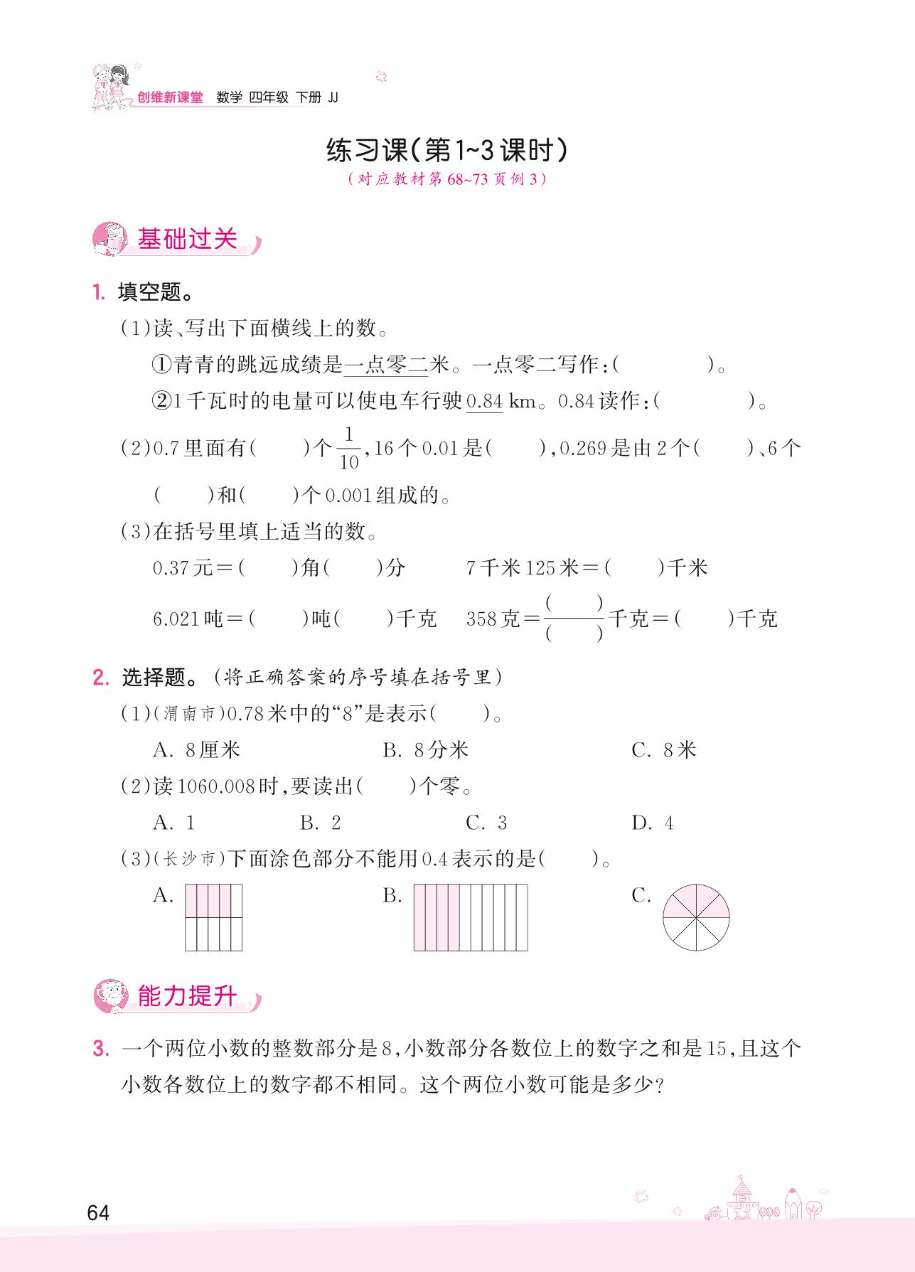 2022下册四年级数学冀教版 六 小数的认识——练习课(第1~3课时)