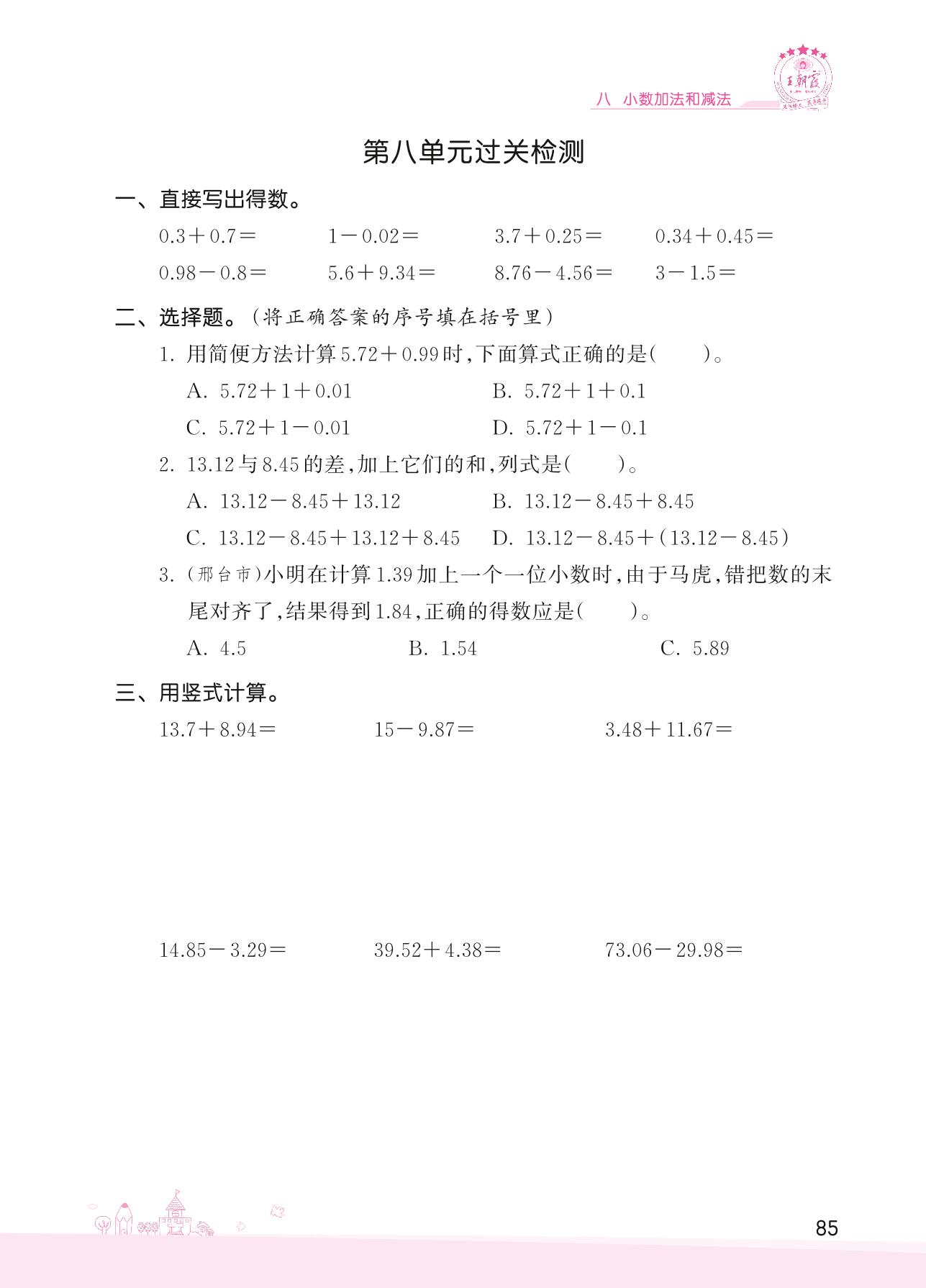 2022下册四年级数学冀教版 八 小数加法和减法——第八单元过关检测