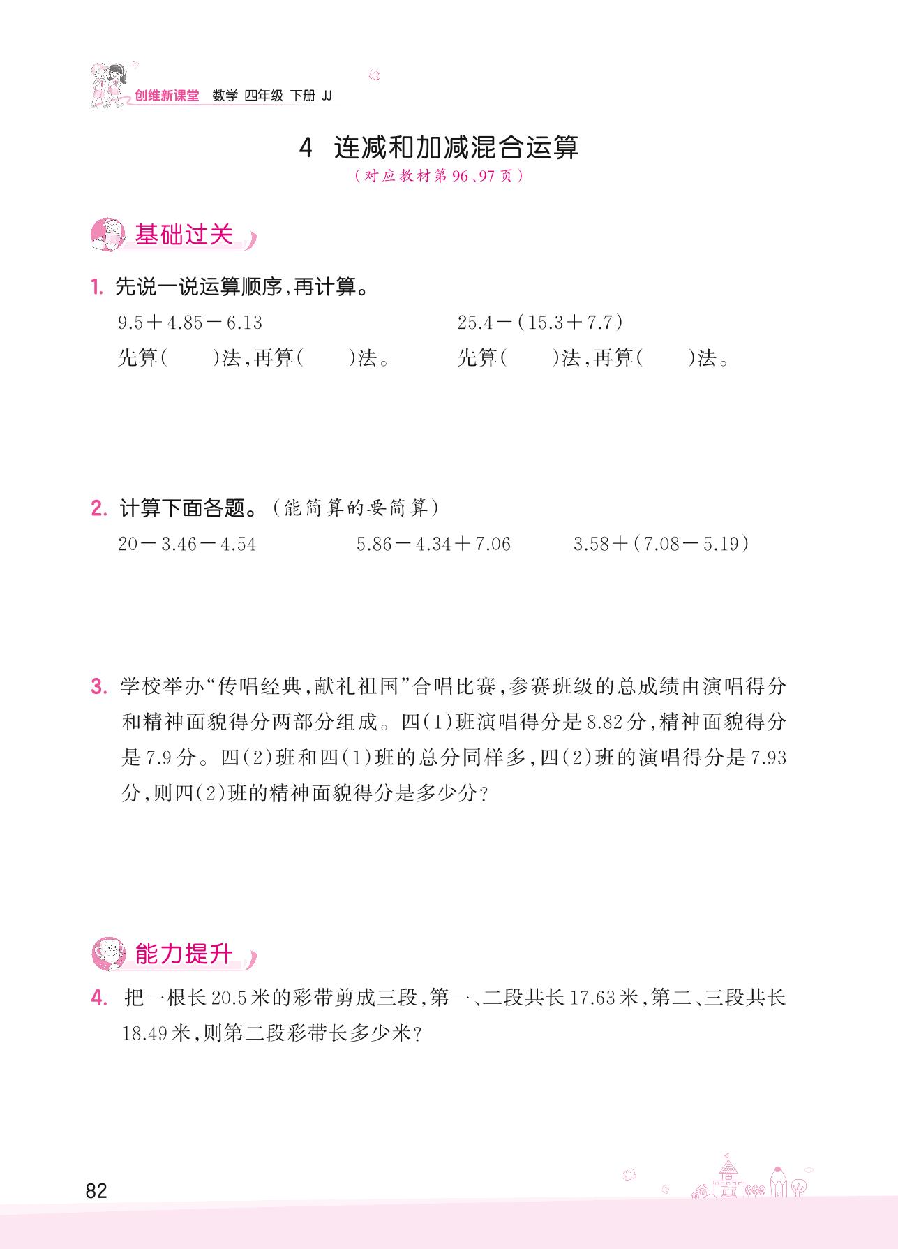2022下册四年级数学冀教版 八 小数加法和减法——4 连减和加减混合运算
