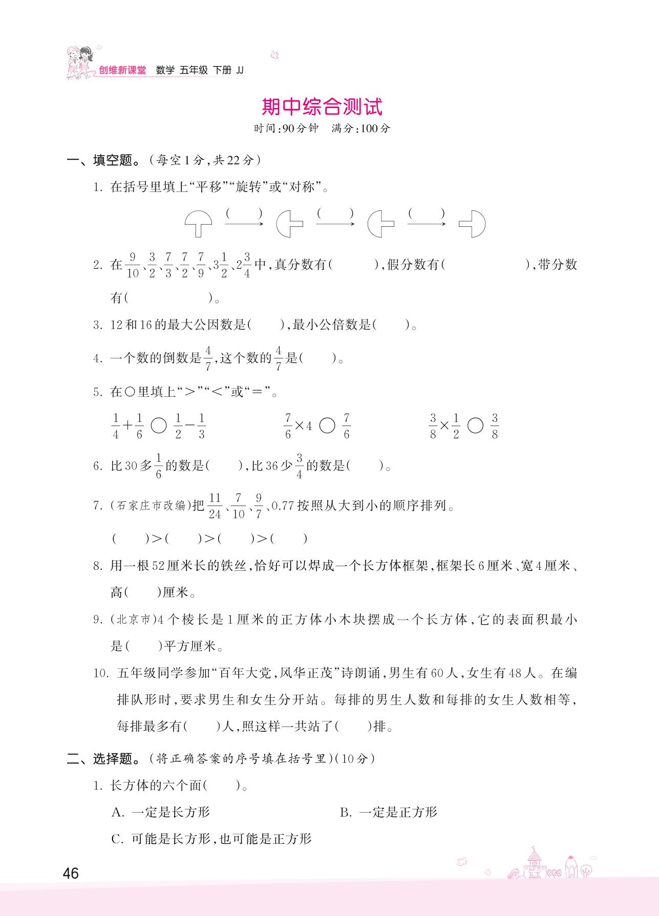 2022下册五年级数学冀教版 期中综合测试