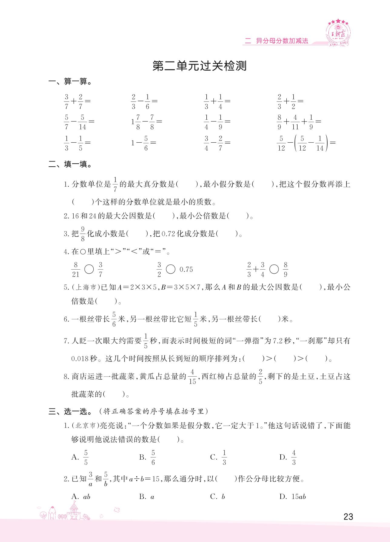2022下册五年级数学冀教版 二 异分母分数加减法——第二单元过关检测
