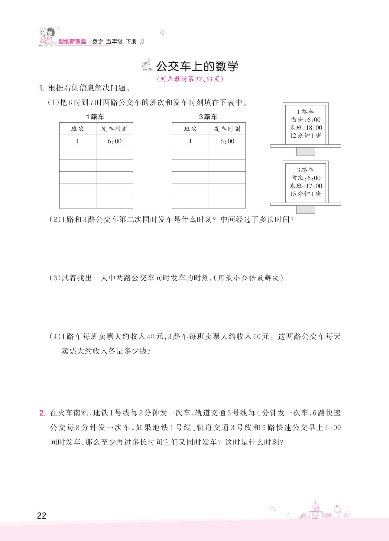 2022下册五年级数学冀教版 二 异分母分数加减法——公交车上的数学
