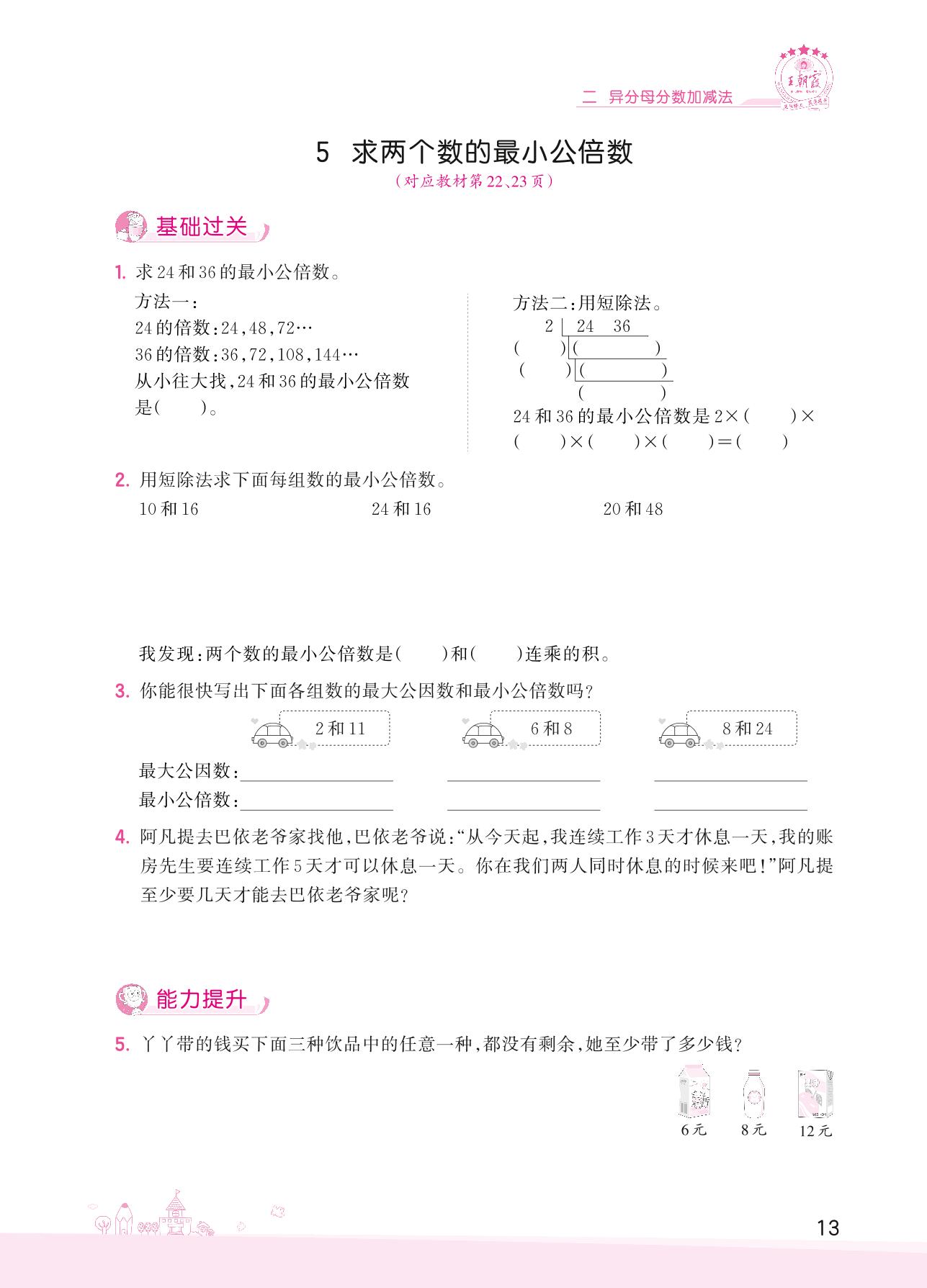 2022下册五年级数学冀教版 二 异分母分数加减法——5 求两个数的最小公倍数