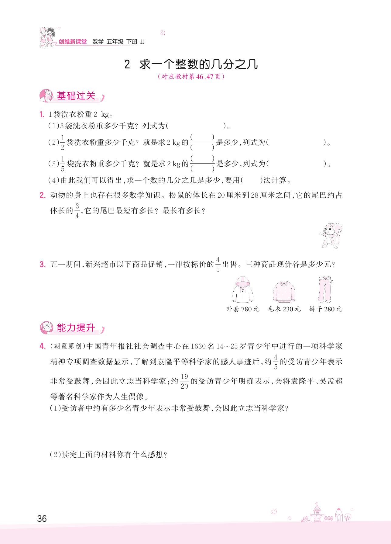 2022下册五年级数学冀教版 四 分数乘法——2 求一个整数的几分之几
