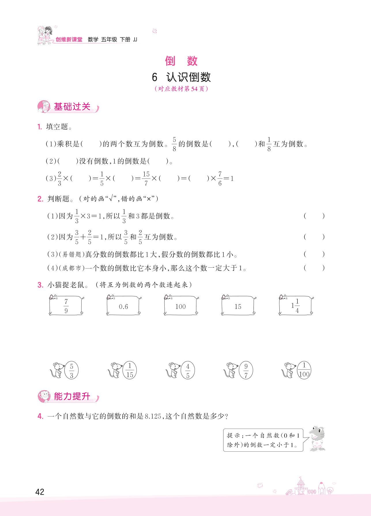 2022下册五年级数学冀教版 四 分数乘法——6 认识倒数