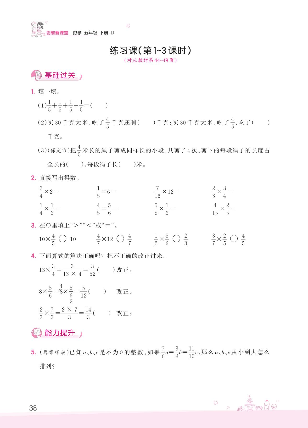 2022下册五年级数学冀教版 四 分数乘法——练习课(第1~3课时)
