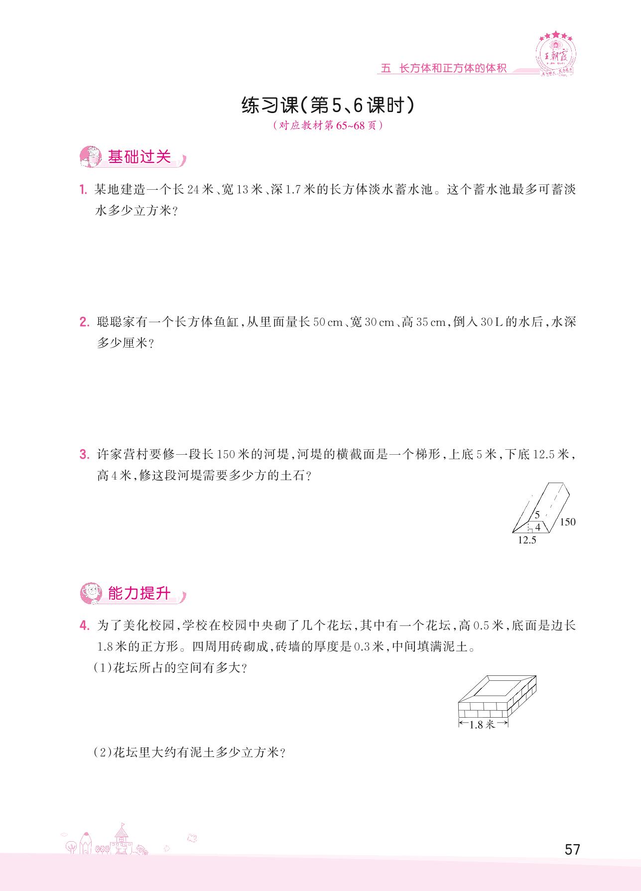 2022下册五年级数学冀教版 五 长方体和正方体的体积——练习课(第5、6课时)