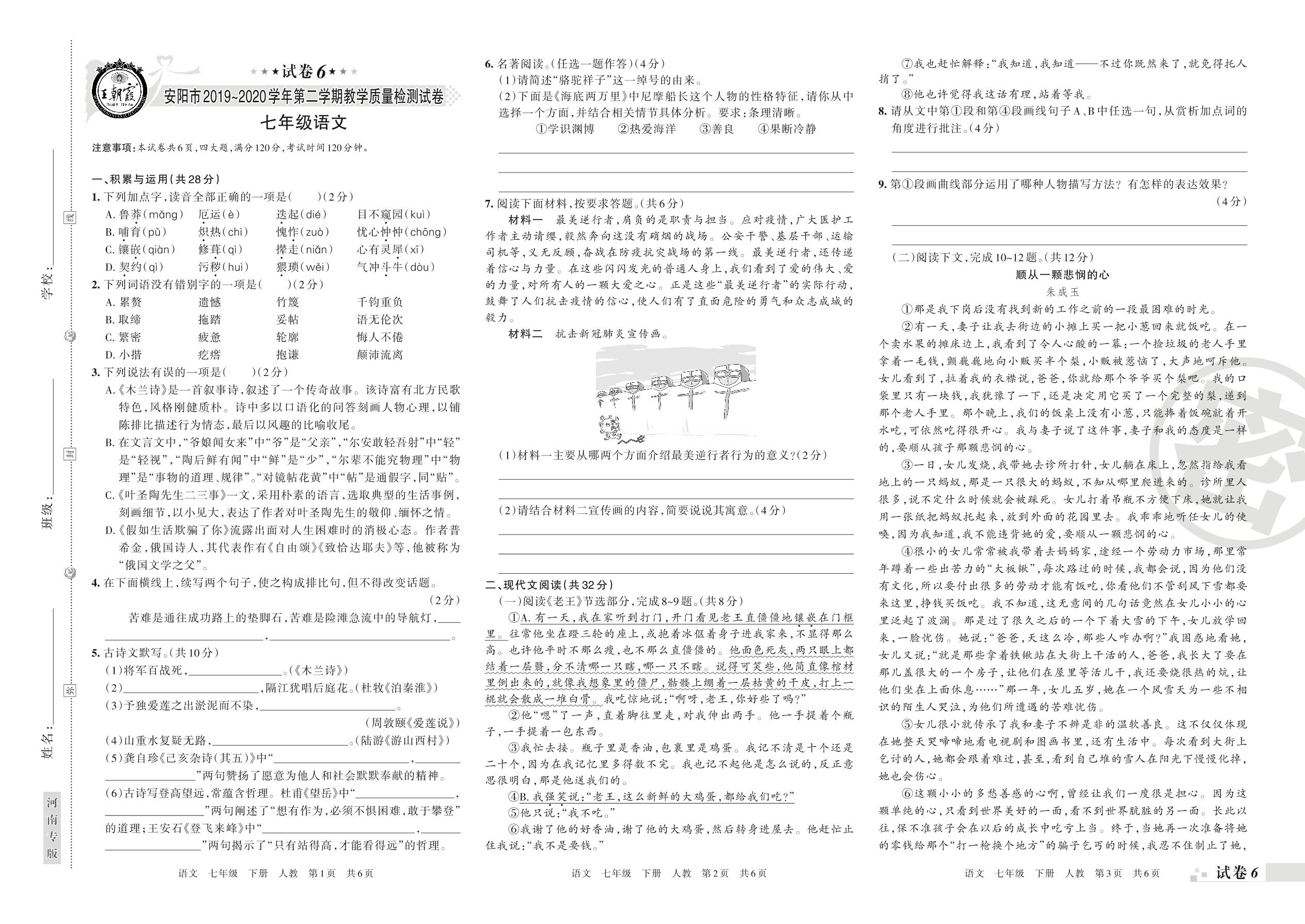 2019-2020学年第二学期安阳市七年级语文试卷(人教版)【6】