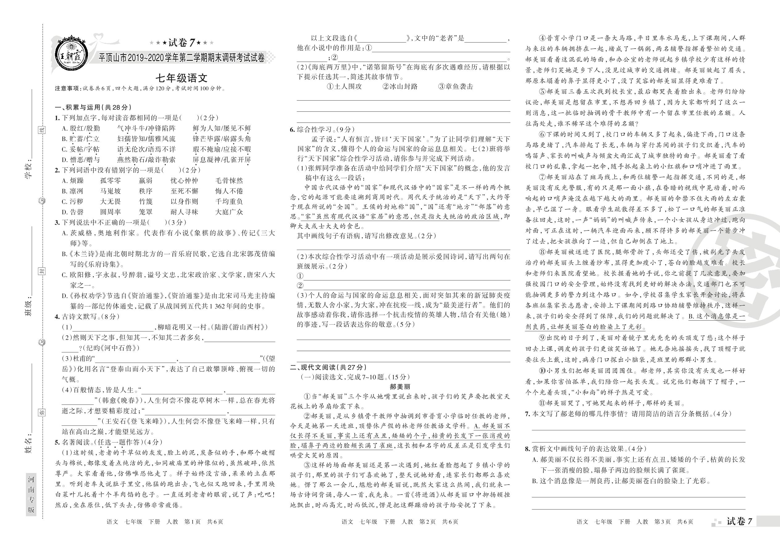 2019-2020学年第二学期平顶山市七年级语文试卷(人教版)【7】