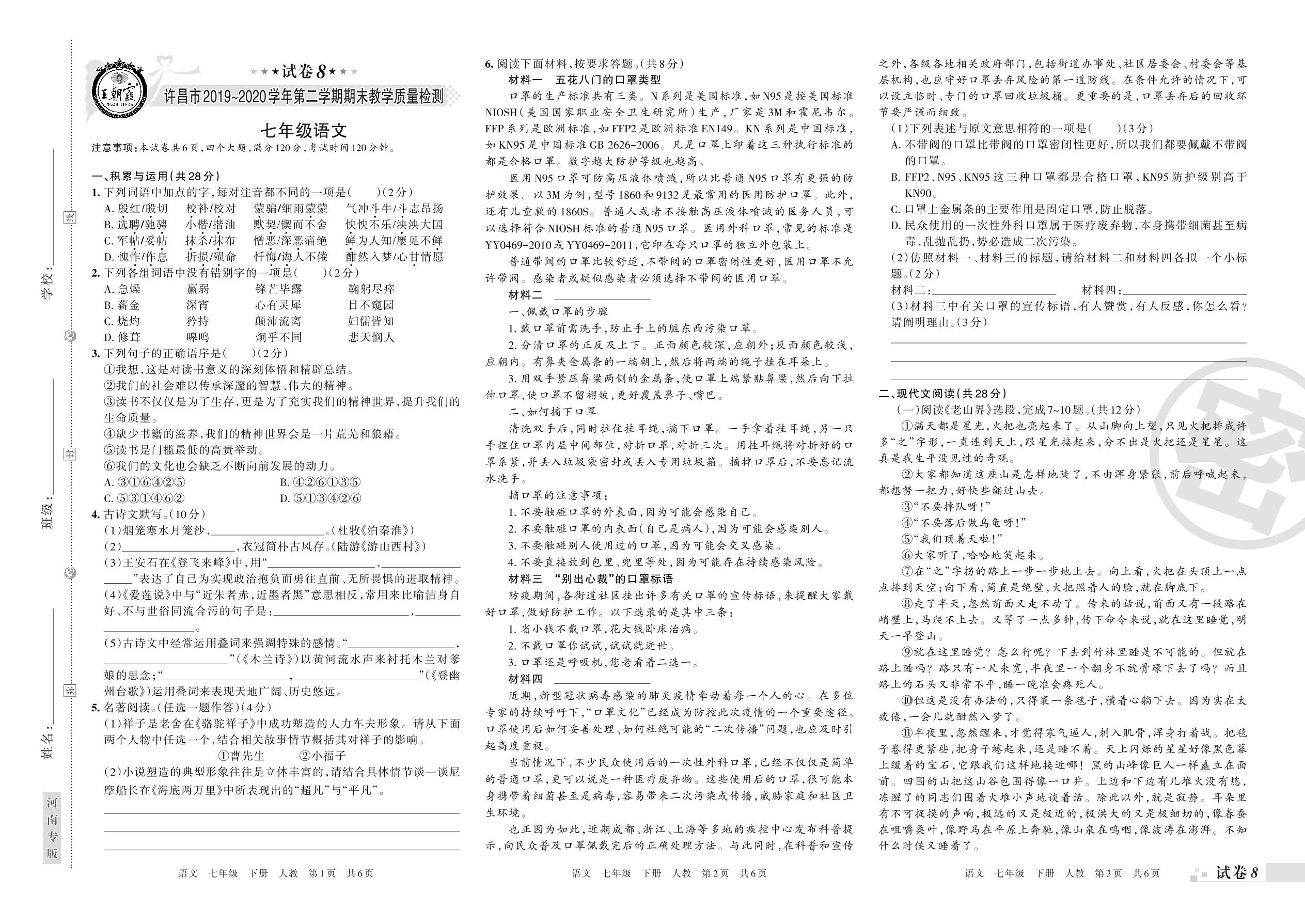 2019-2020学年第二学期许昌市七年级语文试卷(人教版)【8】