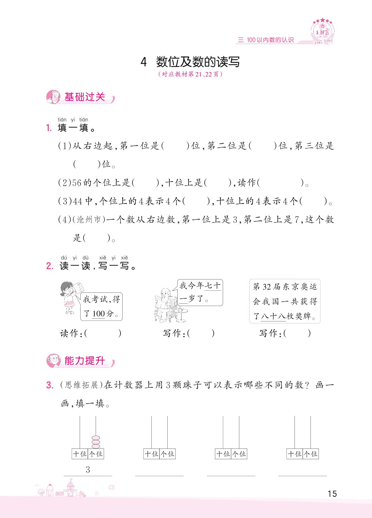 2022下册一年级数学冀教版 三 100以内数的认识——4 数位及数的读写
